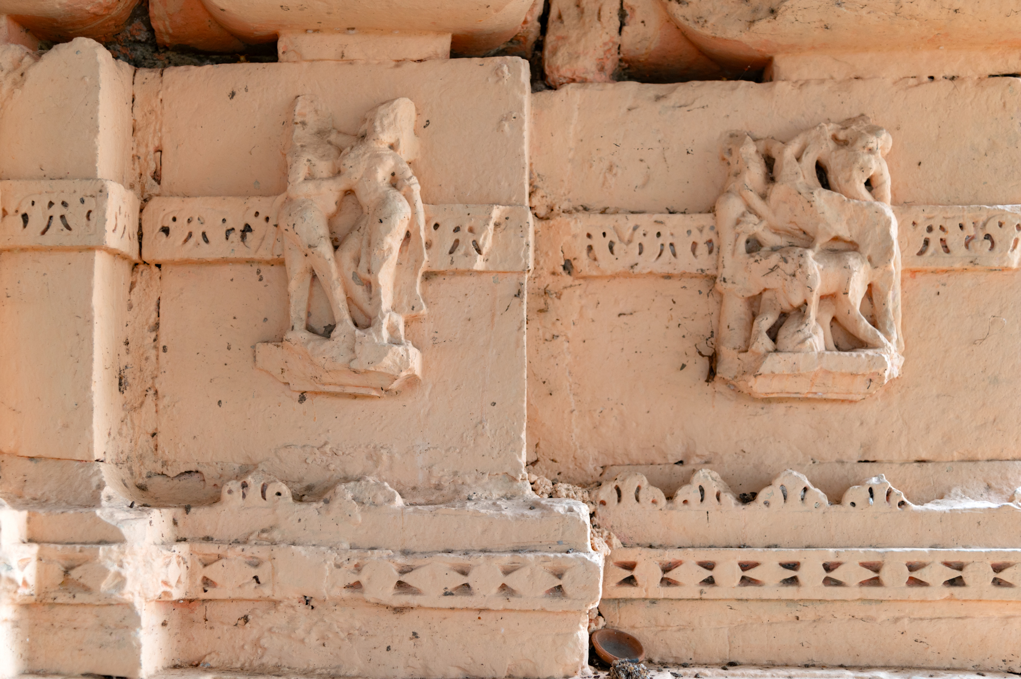 One of the mouldings on the vedibandha of the garbhagriha is the kumbha which is carved with figures of deities, apsaras, mithunas and maithunas. Here, both the mithuna and maithuna imagery can be seen. Mithuna represents a couple embracing each other where the male figure is softly pressing his partner’s breast. The maithuna, next to the couple, shows four figures engaged in amorous activities.