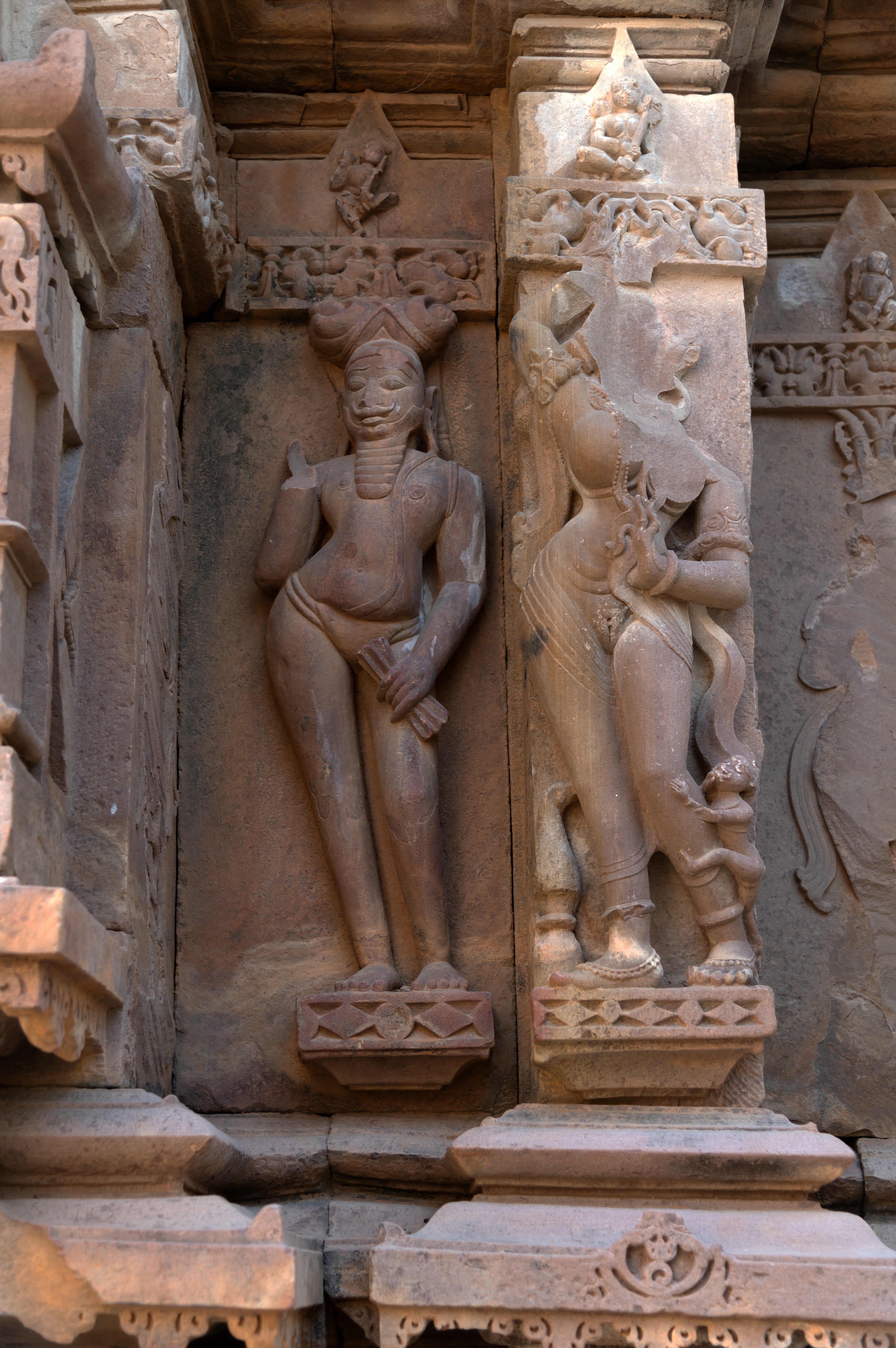 The details of the rear or eastern wall of the garbhagriha (sanctum sanctorum) illustrate the contrast between the ascetic and the surasundari (celestial damsel). The ascetic (on the left) is characterized by a substantial jatabhara (braided hairdo) atop his head, a lengthy beard, and a moustache. His elongated earlobes signify the mahapurusha lakshana (markers of a great individual). His bare upper body is adorned with a broad yajnopavita (sacred thread), with a langot (loincloth) covering his lower body. Despite the apparent damage and raised position of his right hand, his left-hand holds an unidentified object. The damaged surasundari figure, on his right, stands gracefully with a voluptuous body adorned with exquisite ornaments. Though her raised right hand is damaged, she holds a fine scarf in her left hand near her belly, draping it around her arms. Her lower body is covered by a translucent garment so delicate that her body underneath is visible. A small creature is depicted climbing her left leg. In stark contrast to the tranquil and composed posture of the ascetic, the surasundari vividly embodies sensual beauty. Notably, there is a kalasha (pitcher) placed at the bottom near her feet, surrounded by foliage symbolizing abundance and growth, mirroring the symbolism of the female body.