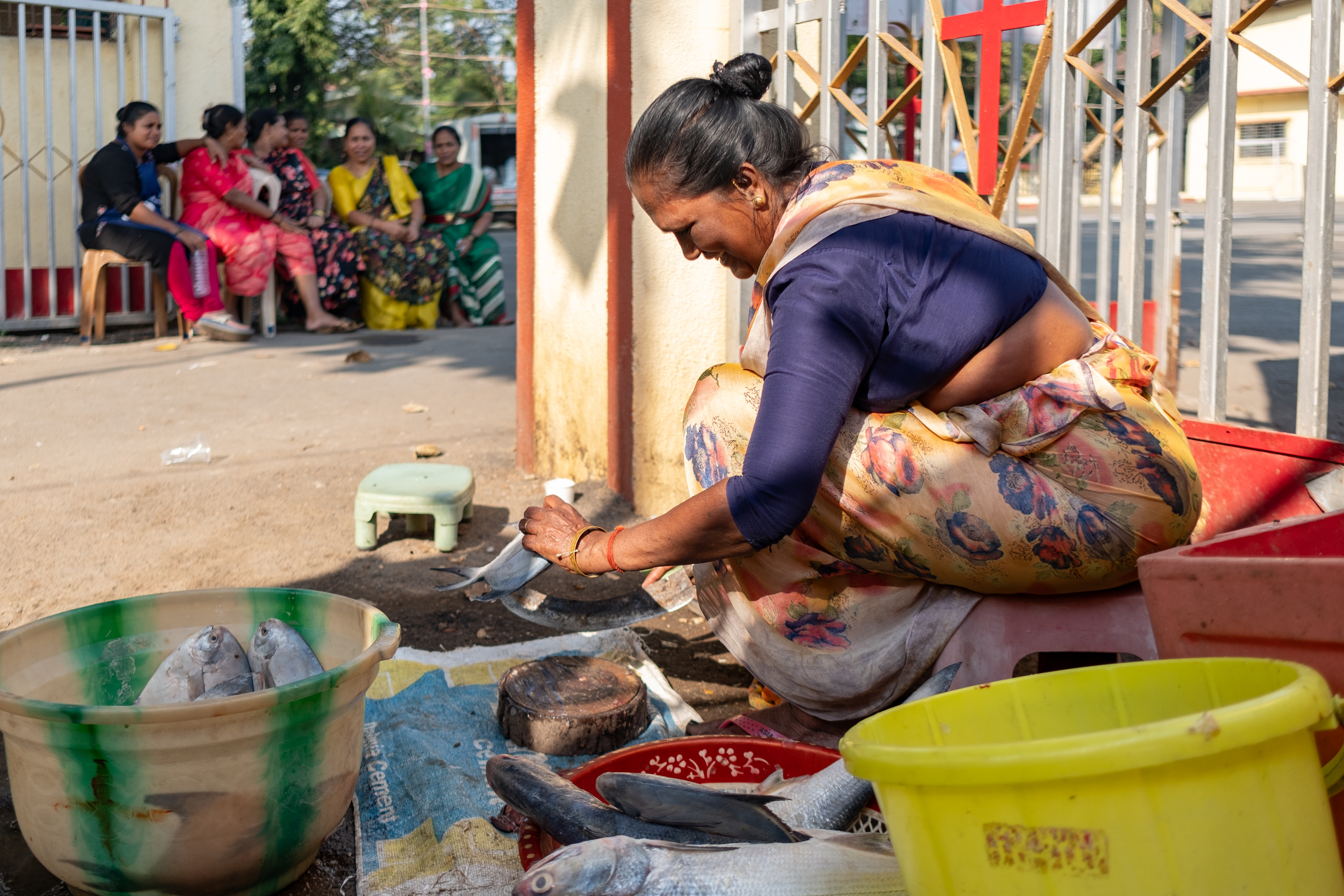 The Koli women are the backbone of the Koli community. They are industrious and entrepreneurial, managing their household and family businesses with skill and expertise. A typical day for Koli women starts very early, long before sunrise. They travel long distances to wholesale fish markets to buy a fresh catch and sell it in the local market, after which they devote time to running their household.