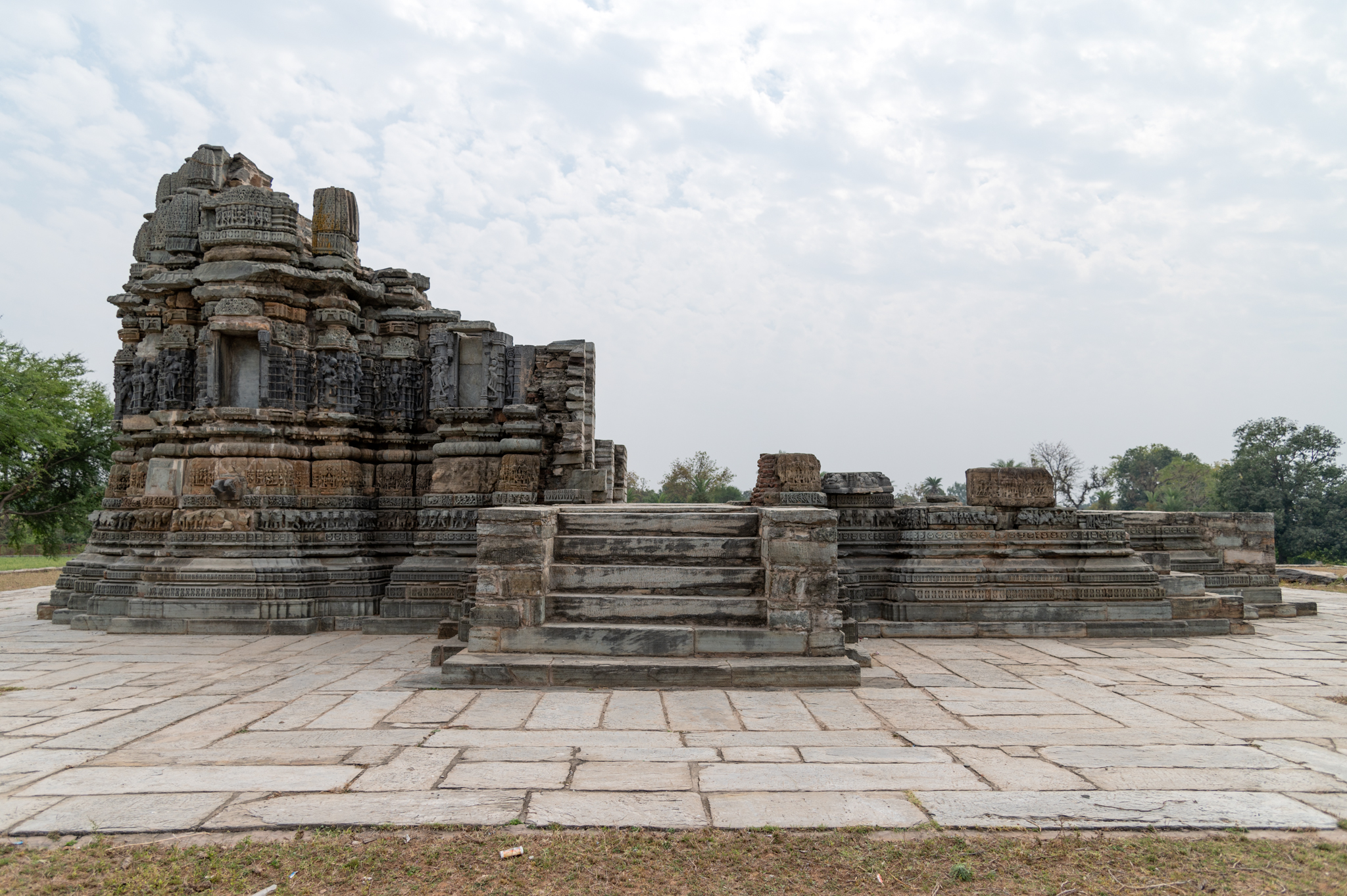Seen here is the north-facing elevation of the Chaunsath Yogini Temple. At the centre of a high plinth, there is a single shrine temple of which only the garbhagriha (sanctum sanctorum) has partially survived. Originally, the temple must have had a garbhagriha, an antarala (vestibule and antechamber) and a mandapa (pillared hall) with attached mukhamandapas (front porch). There are two varieties of sandstone used in the construction of this temple.
