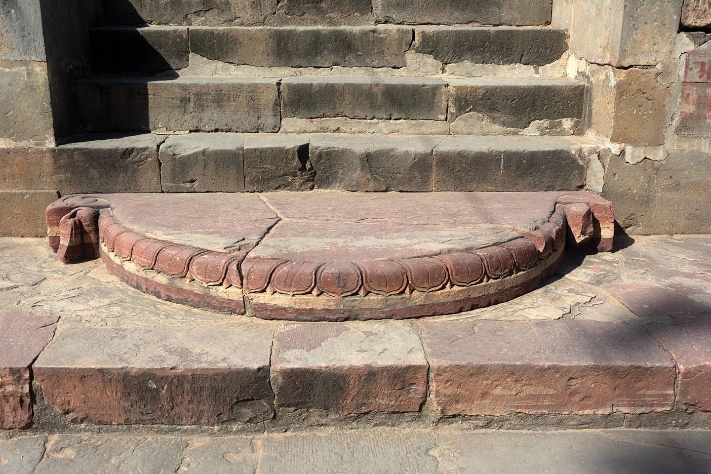 Steps lead up three levels to the main temple at the top. The steps on the adhisthana have a chandrashila (moonstone) on the third step. Moonstone is a hemispherical stone in the shape of the moon placed at the entrance of Hindu temples and is designed like a lotus flower.