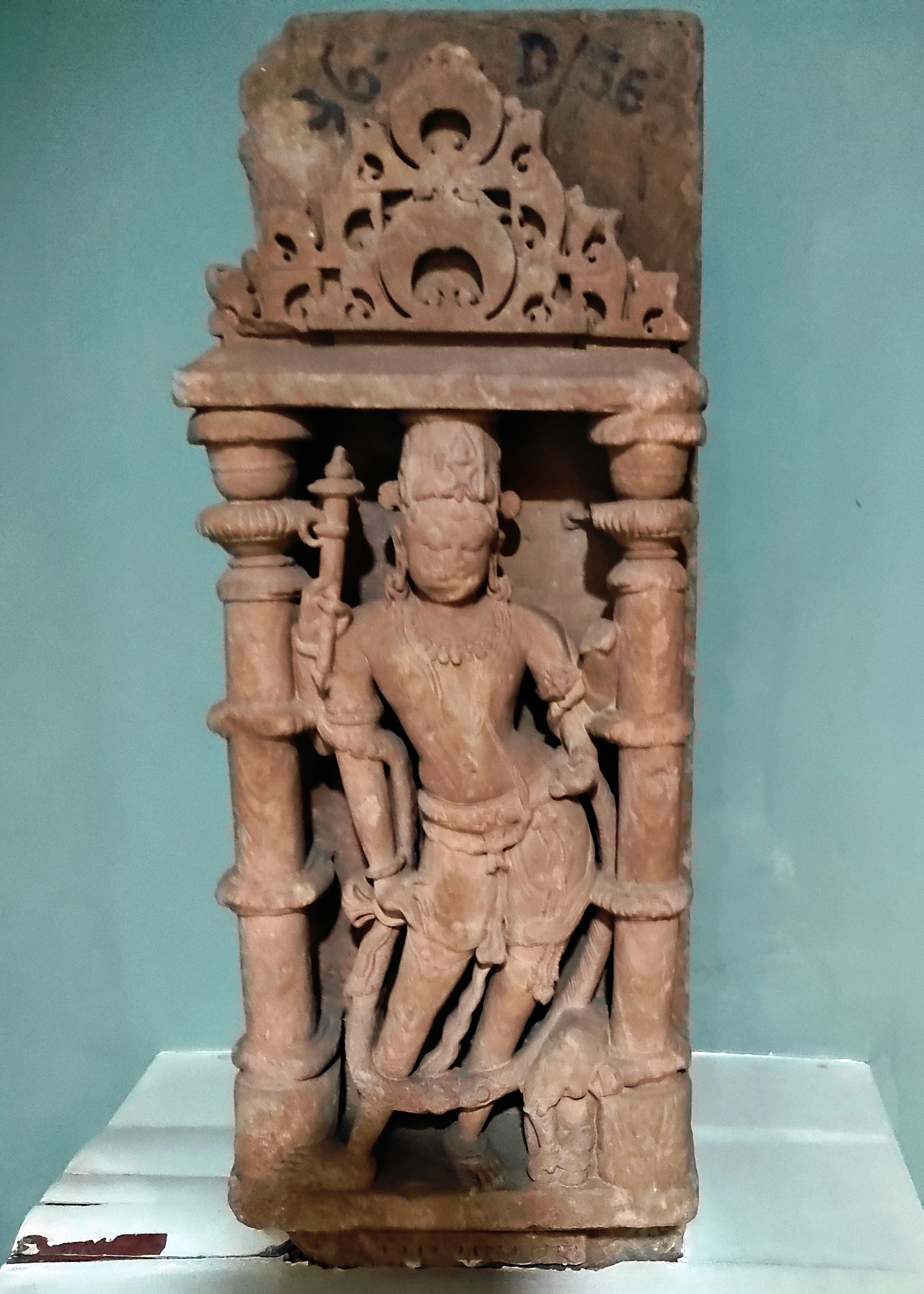 A four-armed Indra placed inside a devakostha-niche, easily identifiable by his vahana, an elephant. The loose architectural fragment from Harsha Hill is now housed in the Government Museum, Sikar. Although the two hands on the left side are broken, the upper right holds an ankush and the lower one gracefully rests on his right leg. Image courtesy: Government Museum, Sikar