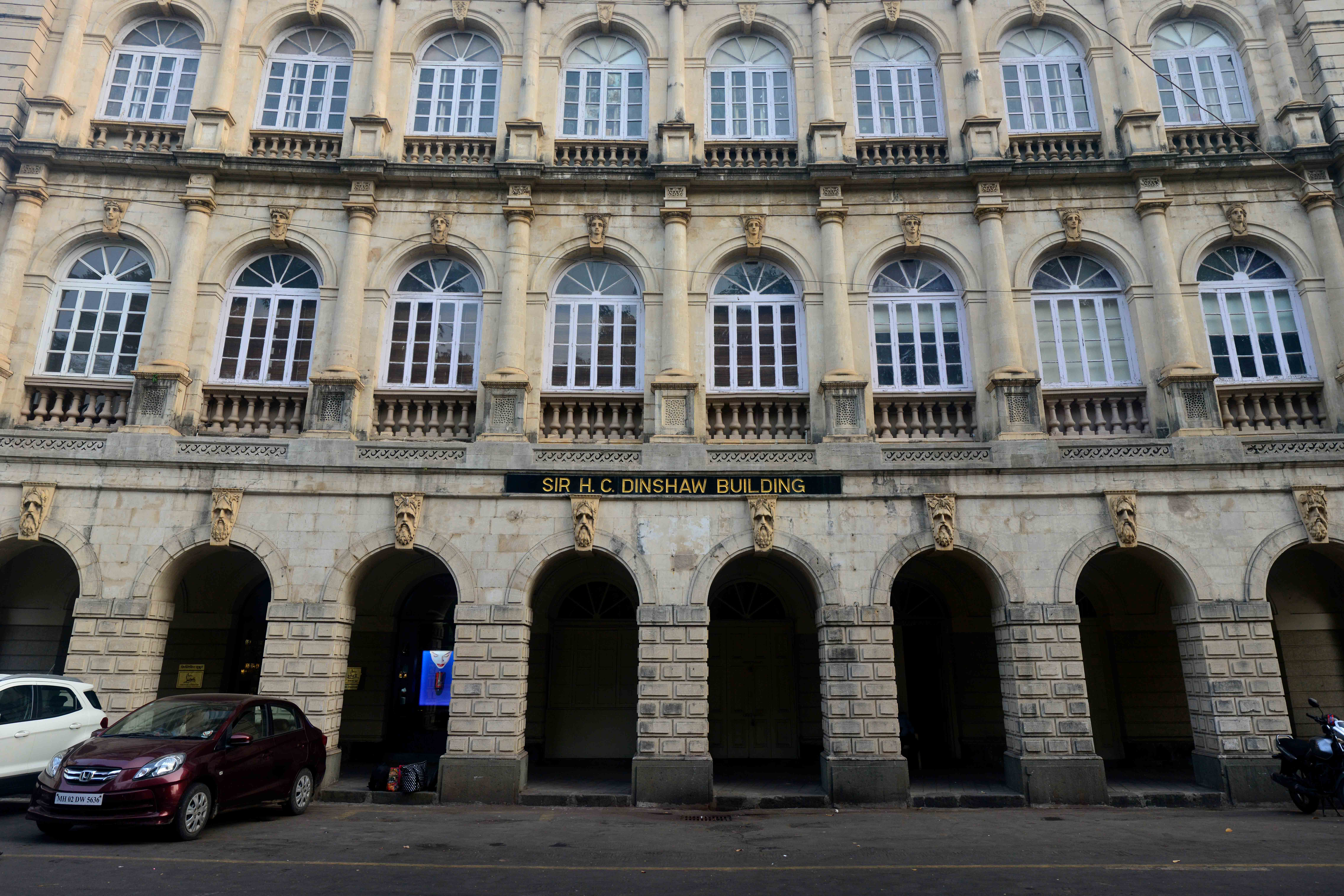 Facade of Sir HC Dinshaw Building at 16 Horniman Circle. The building was constructed in 1924 on the location of the Bank of Bombay (now the premise of State Bank of India), which was the first building erected on the Circle. The building is one of many establishments owned by the Parsi community in and around the Horniman Circle.