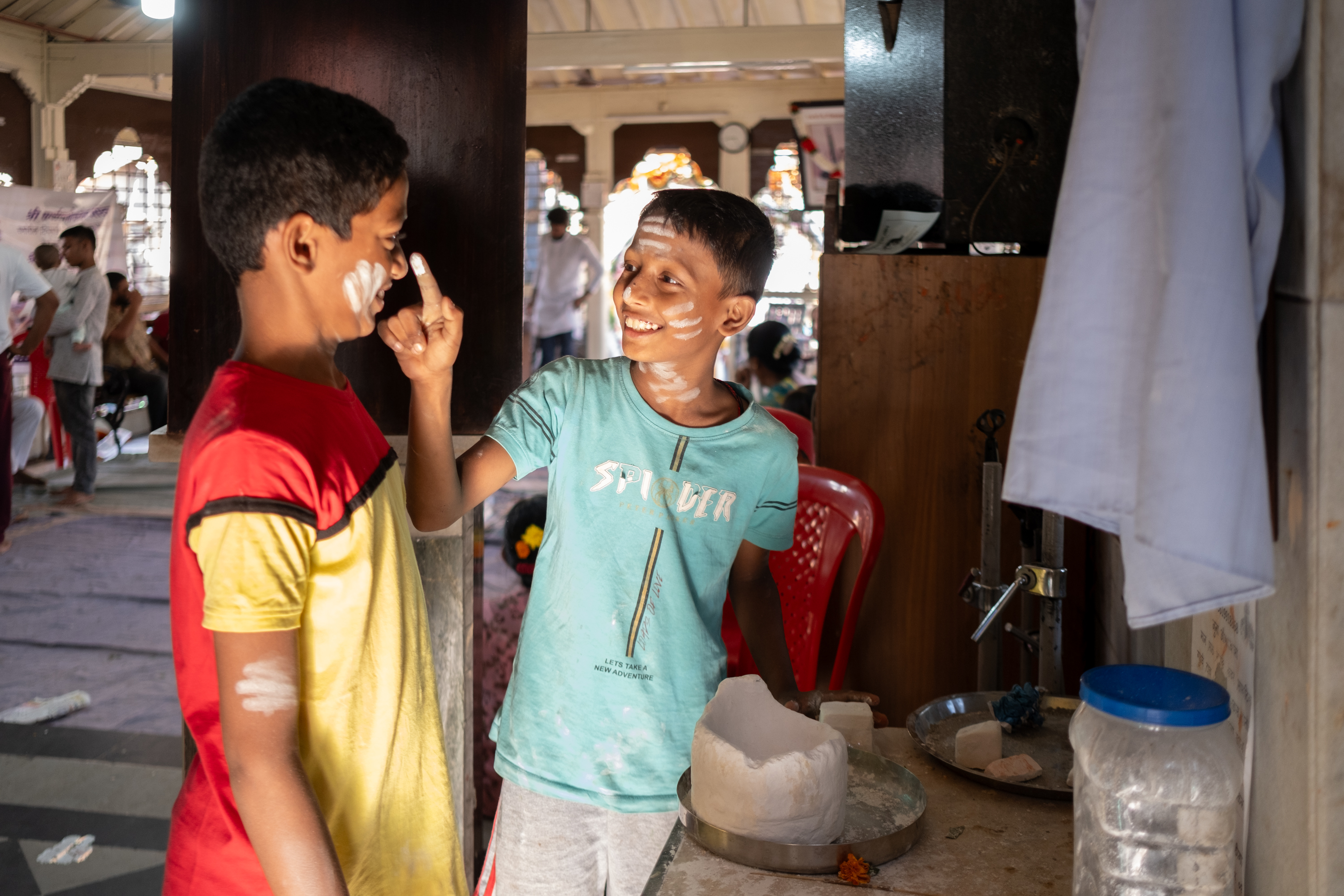 Children apply bhasma (sacred ash) to their forehead, face, and arms. In Shaivism, bhasma (also known as vibhuti) reminds devotees of the transient nature of life, as it is a product of fire and symbolizes the ultimate reality of death and the dissolution of the physical body.