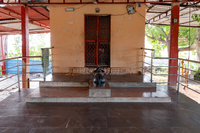 The mandapa of the temple is open and has only base mouldings belonging to the old structure. It now has a smooth tile floor and there are two broad stairs at the end which lead to the main sanctum. A black stone figure of nandi facing the sanctum is placed on one of the stairs. The front wall of the main sanctum is also a new structure with a metal gate to enter the sanctum. The udumbar (threshold) of the sanctum has the original part of the temple which now is the only decorative element left of the entire façade.