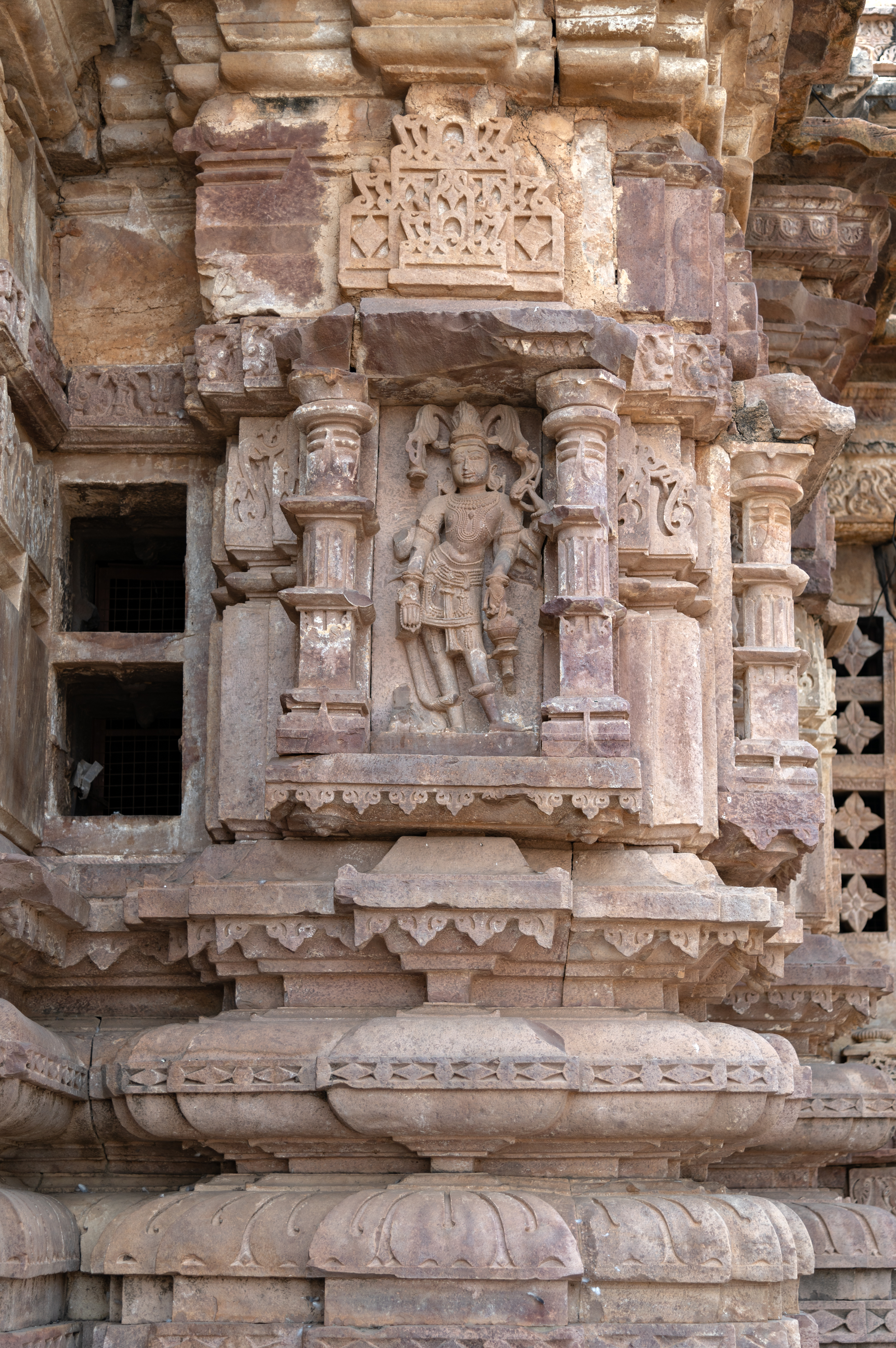 At the opposite side of Kubera, Ishana is depicted, holding a trishula (trident) in his upper right hand, albeit now damaged. His upper left-hand grasps a sarpa (serpant), while his lower left-hand holds a kamandalu (water pot). Positioned in Varada hasta (hand gesture of conferring a boon), his lower right-hand carries a rosary. At the bottom, a bull was originally carved, though it's now broken.