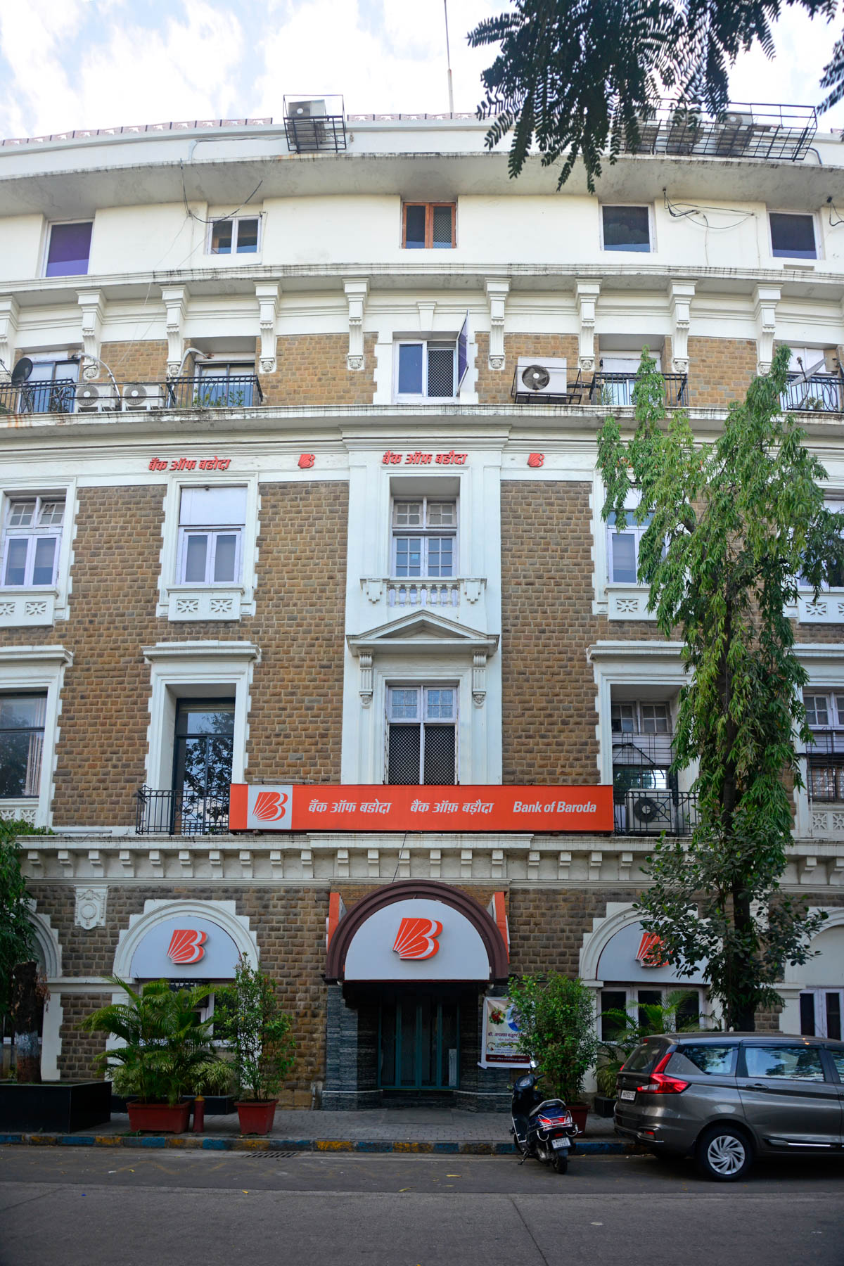 The Shaw Wallace building on Walchand Hirachand Marg is now known as the Bank of Baroda building, which is housed in it. The ground floor has semi-circular arched windows while the windows on the upper levels are rectangular and framed with plaster moldings. Above the central entrance is a pediment supported on decorative brackets which is a balcony with balustrades.