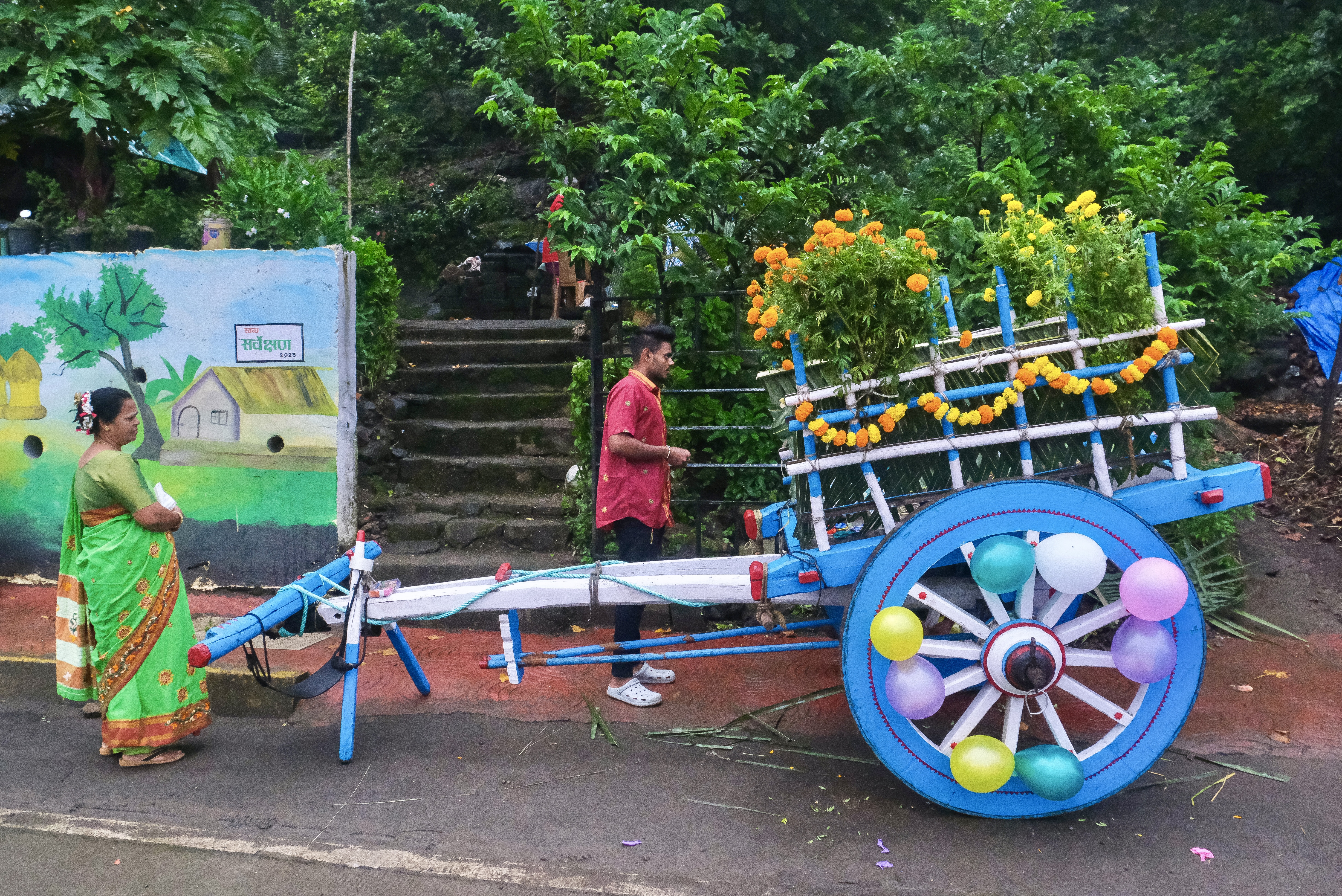 The fresh harvest is transported on specially decorated wooden carts. Each cart is pulled by a pair of horses or bullocks.