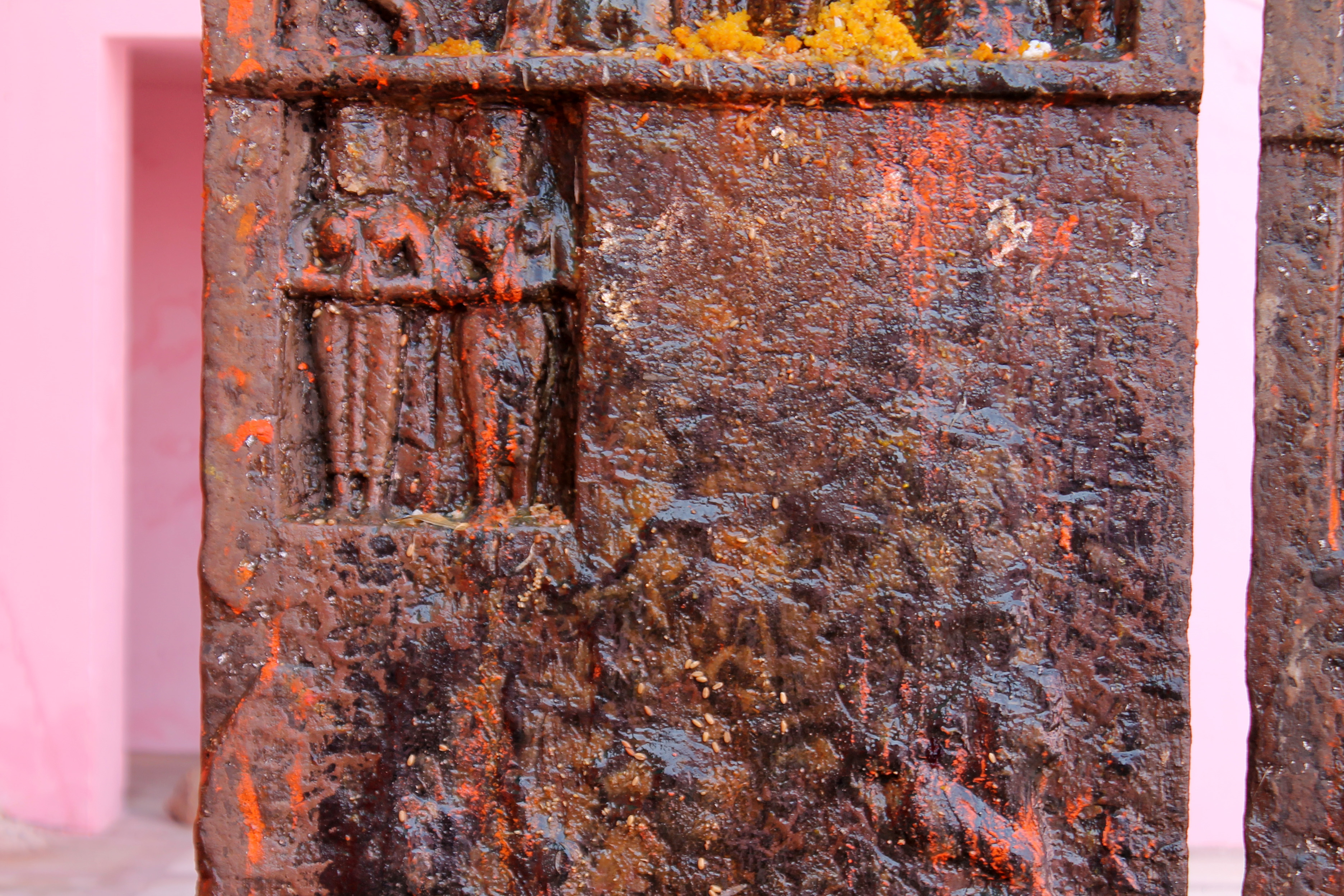 In the second small panel in the hero stone, positioned just below the row depicting the hero, stand two female figures with folded hands in namaskar mudra (salutation gesture). Their upright posture is emphasized by their drapery consisting of a decorated lower garment. The female figures represent celestial damsels believed to have arrived to escort the hero to heaven.
