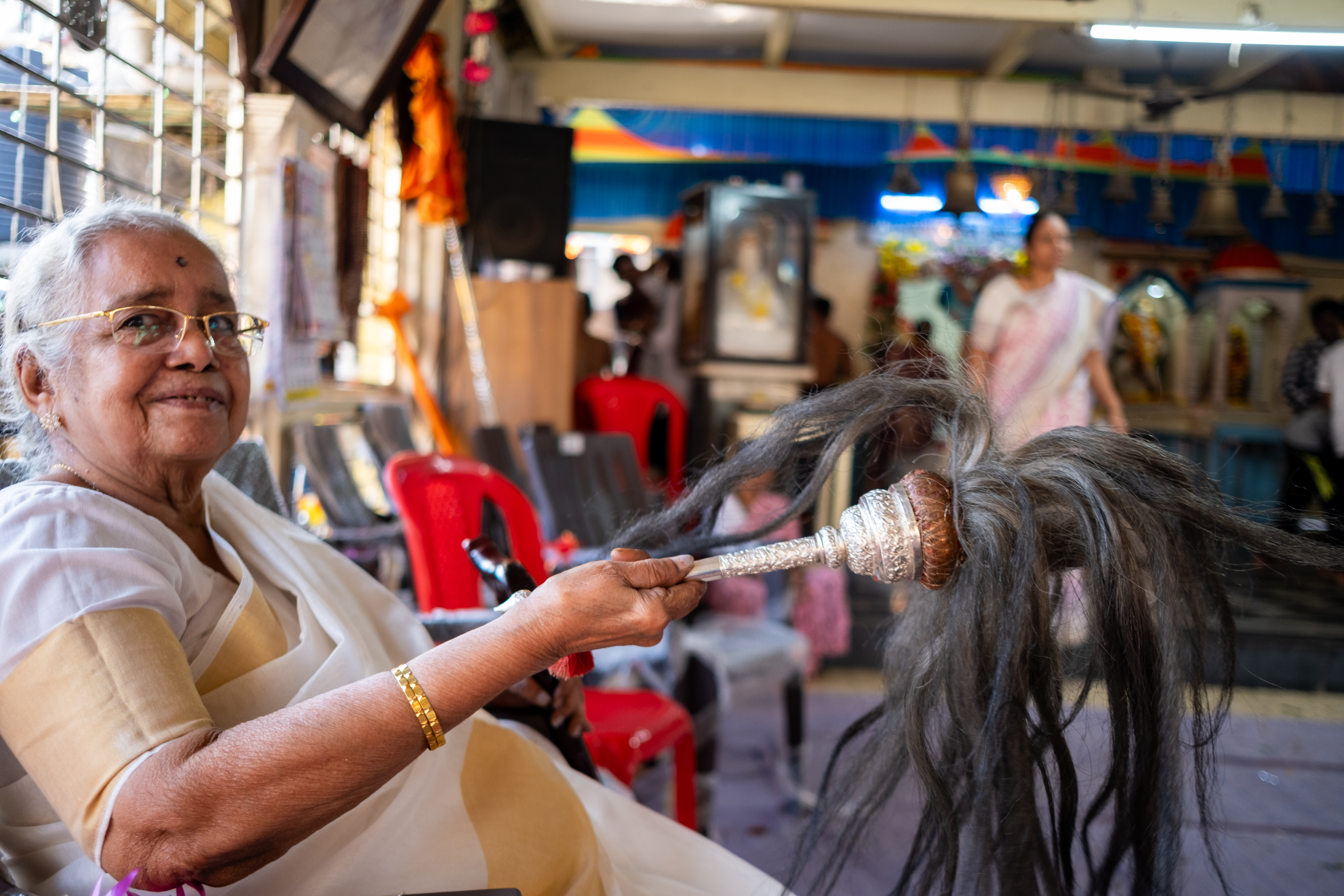 A lady is holding a fly whisk (chowrie or chamara) with an ornate silver handle. Typically made from the tail hairs of a yak, the fly whisk is associated with royalty and divinity. In ancient times, it was used by attendants to fan kings, indicating respect and reverence.