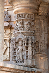The mukhamandapa (front porch) of the Mahakal Temple serves as a narrow corridor flanked by kaksahanas (seat backs) on either side, with four pillars supporting its flat roof. These pillars have square bases intricately carved with divine figures on all four sides. The upper section adopts an octagonal shape, embellished with miniature niches on all sides housing seated goddess figures. Crowning this, there's a band adorned with various figures and a kirtimukha (face of glory) motif.