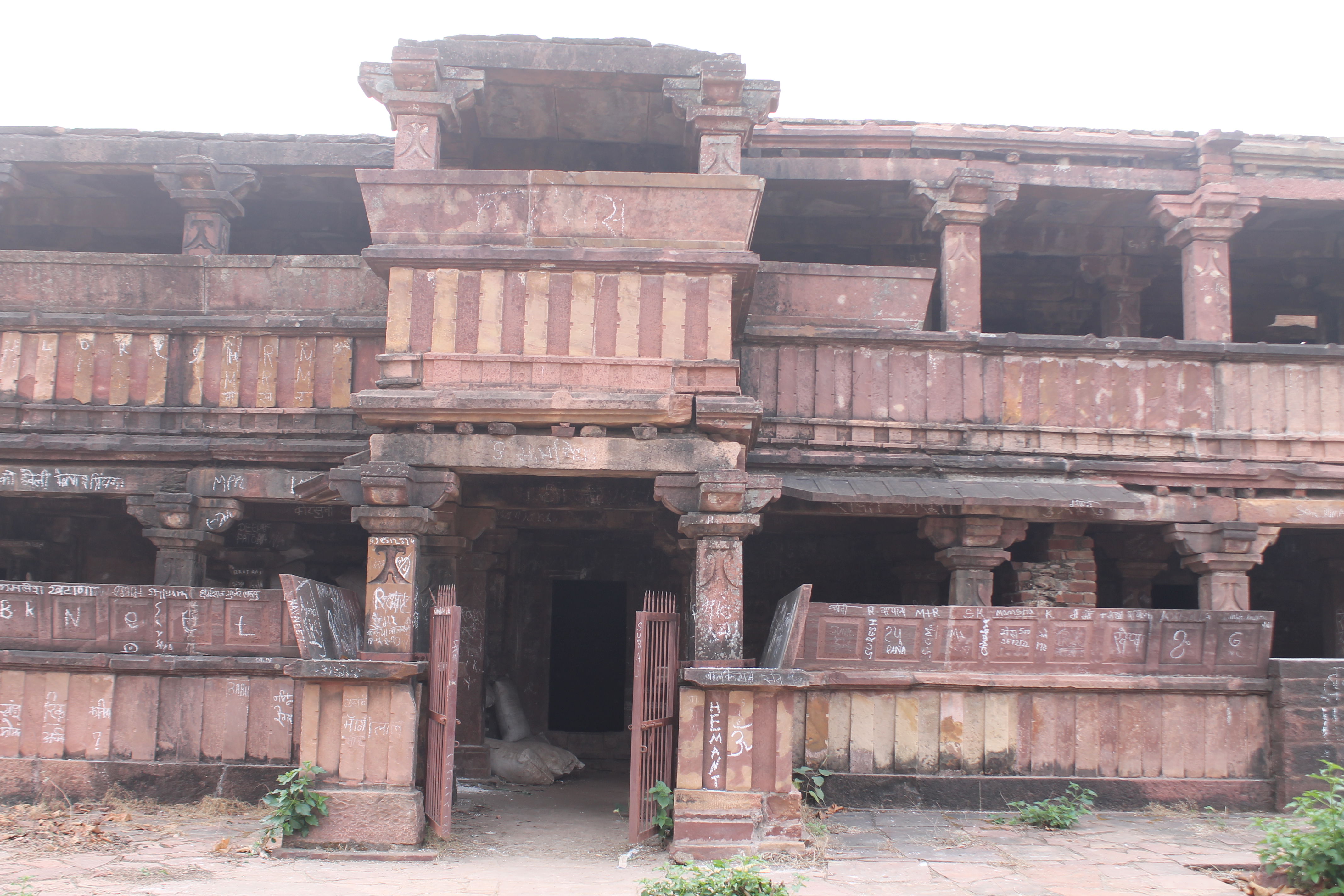 Seen here is the principal entrance of the matha (monastic or residential building) of the Suhaveshwar Temple, facing north. At the centre of the façade, there is a protruding mukhamandapa (front porch) with a balcony above it. Both floors of the matha are semi-open. The north-facing wall has dwarf walls with pillars at regular intervals. The dwarf walls of the matha must have had kakshasanas (seat backs), but several of the slender seat backs are now lost.
