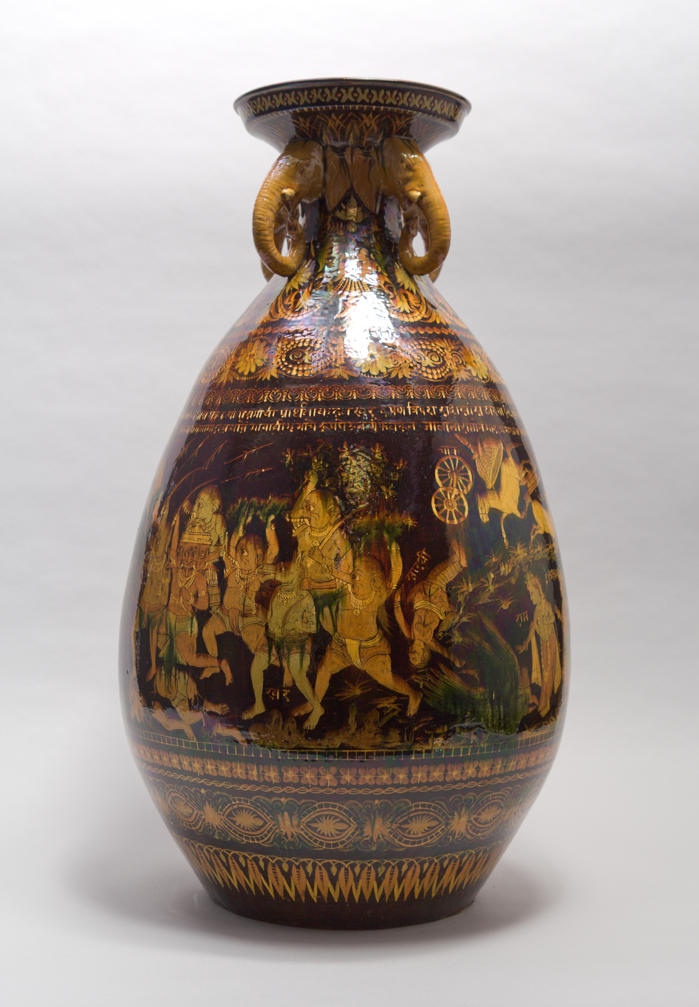 Drawn from the third book (“Aranya Kanda”) of the Ramayana, the elaborate narrative on this vessel depicts key scenes in the Dandaka forest. Created by the Bombay School of Art in an effort to preserve Indian craft, the object features many embellishing motifs drawn from the Buddhist murals of Ajanta. These features include the lotus and pearl band running around the shoulder and the monster faces (kirtimukha), set between the addorsed elephant heads, that spit out a garland of jewels. Although the vase is grounded in the Indian tradition, British neoclassical taste clearly underlies its shape and some of its geometric motifs. Given the scale and inscribed multiscene narrative, this vase may have been produced for the London Colonial and Indian Exhibition of 1886.