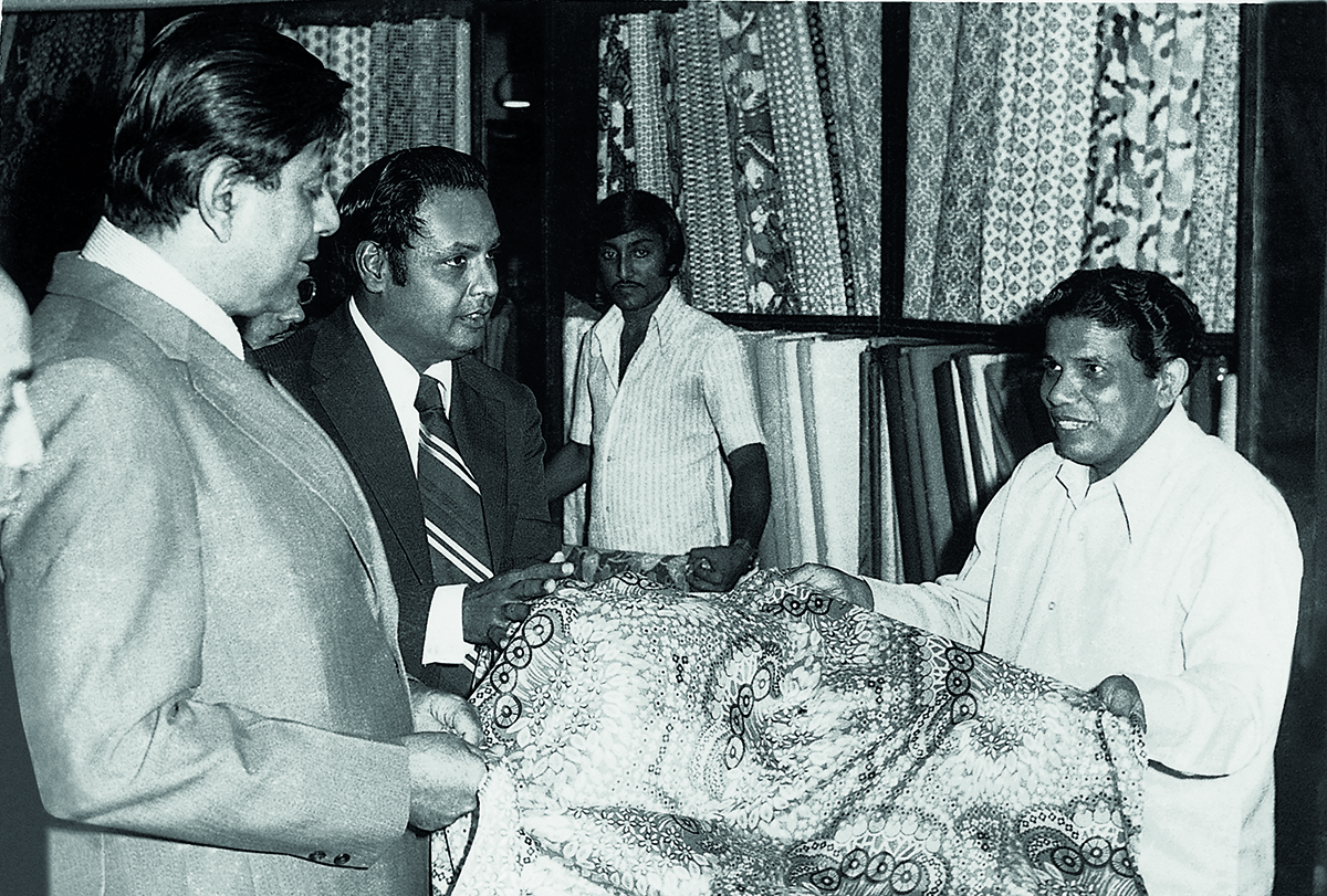 Jamanbhai Mehta, a friend and colleague of Shri Dhirubhai Ambani from Aden, displays Vimal fabric for Shri Bose Mullick, the Commerce Secretary, at the first exclusive Vimal showroom that opened in 1972 near Opera House, Bombay. Image Courtesy: Reliance Industries Limited.
