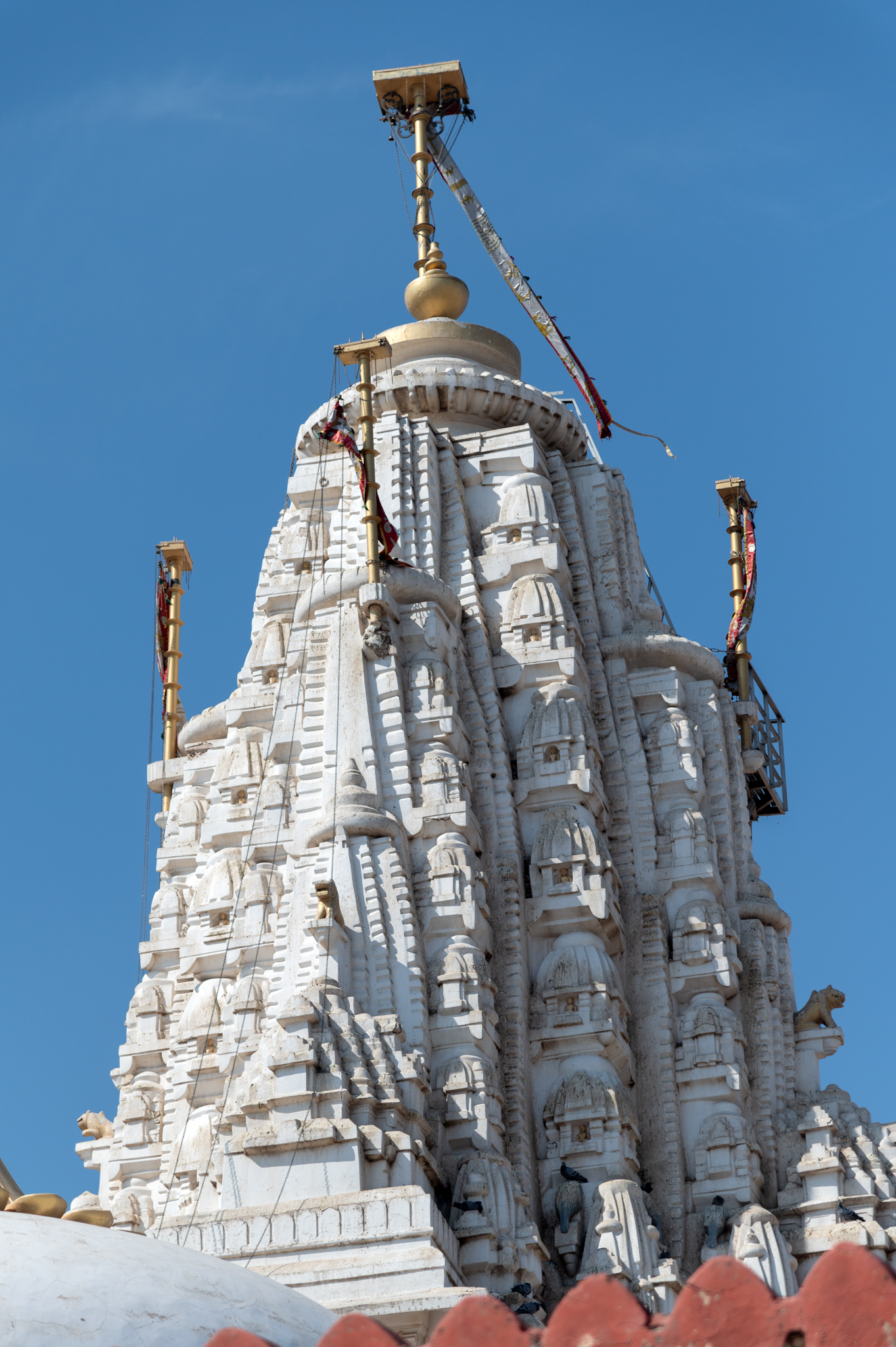 Details of the south-facing side of the shikhara (superstructure). The cardinal bands of the shikhara have their simulations, known as the urah shringas (miniature shikharas) cascading the mulashrinaga or the main shikhara. The urah shringas have ribbed edges, similar to the mulashringas. Since they diminish in height and emanate out of each other they present a conical cascading effect.