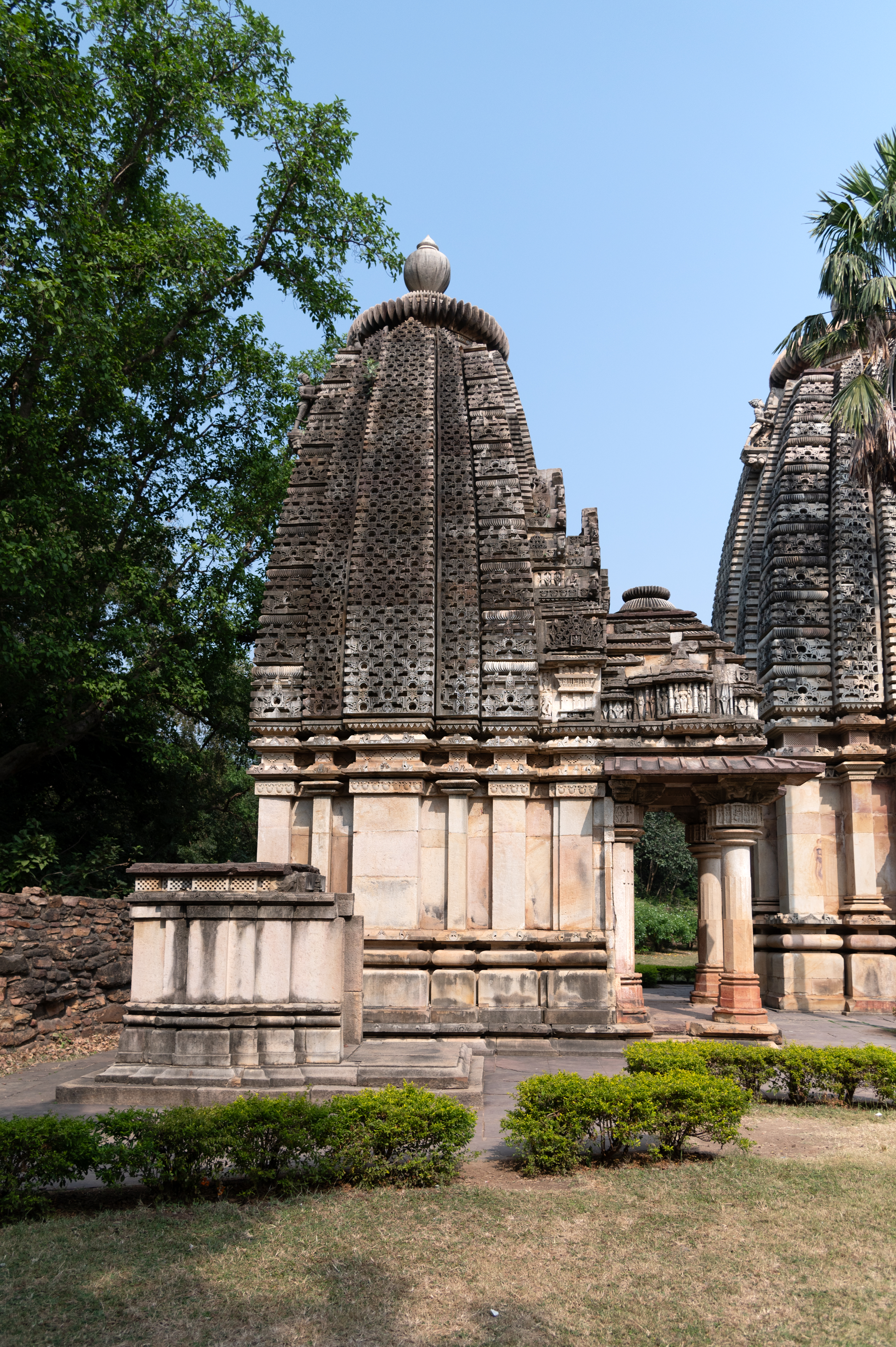 The Mahishasuramardini Temple has a pitha (a small platform) and well-defined base mouldings, with a plain jangha (wall) adorned with only a decorative band at its upper part. The varandika (moulded parapet) supports the latina shikhara (mono-spired) with navabhumis (nine tiers). The shikhara (superstructure) is intricately carved with the jala of chaitya arches, and at its apex, it features amalasaraka a segmented or notched stone disk), chandrika (are a series of amalaka discs), another amalasaraka topped by a kalasha (pitcher shaped finial).