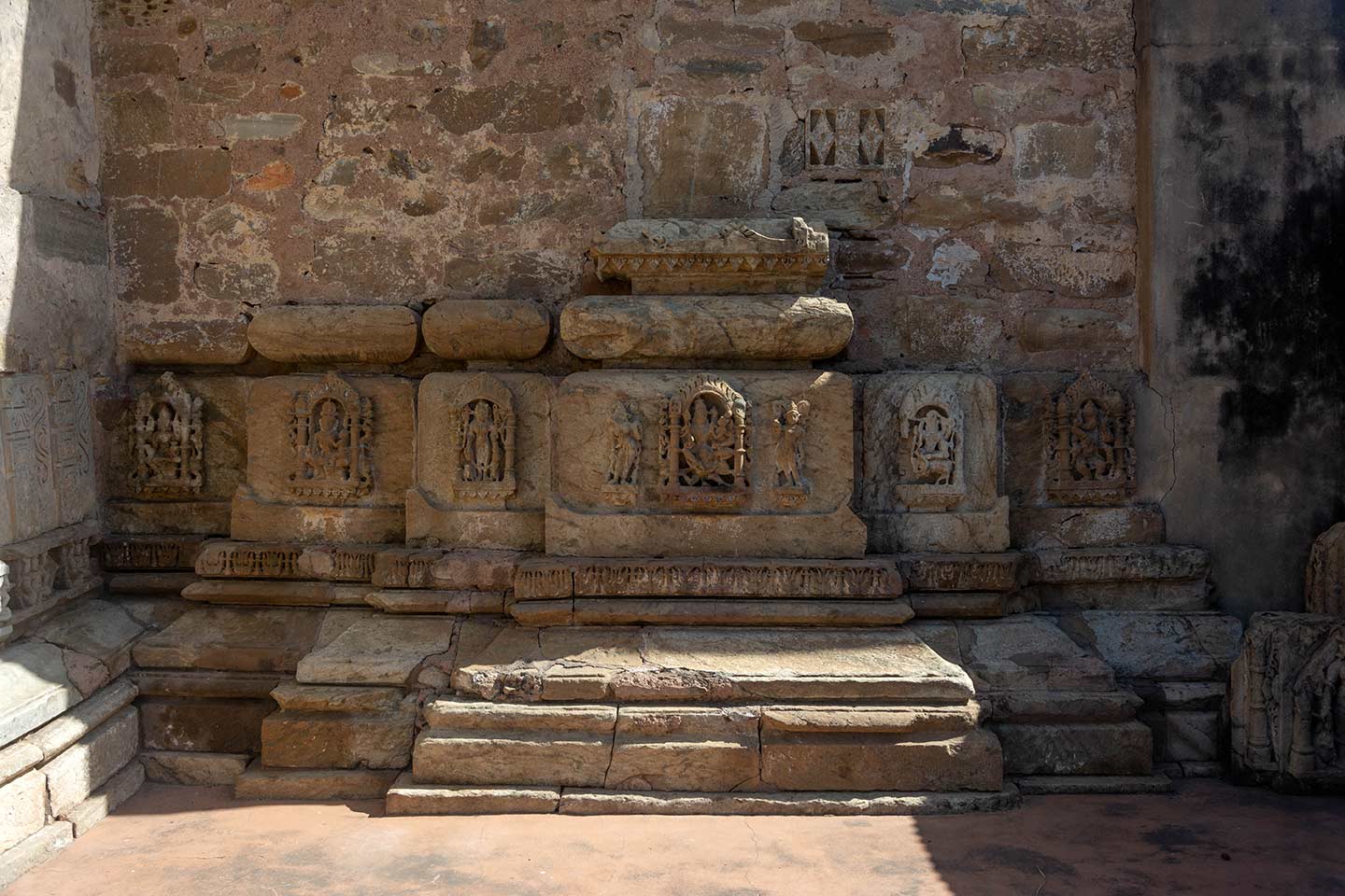 Seen here is the exterior of the southern shrine in the Neelkanth Mahadev triple-shrine temple. The walls of the shrine have fallen, leaving only the plinth up to the level of the kumbha (pot) molding in situ. Few traces of the kalasha (pitcher) moulding above the kumbha have survived. The faces of the kumbha molding have depictions of various deities. The central kumbha corresponding to the main bhadra (central projection) of the temple has Vishnu Lakshmi on Garuda.