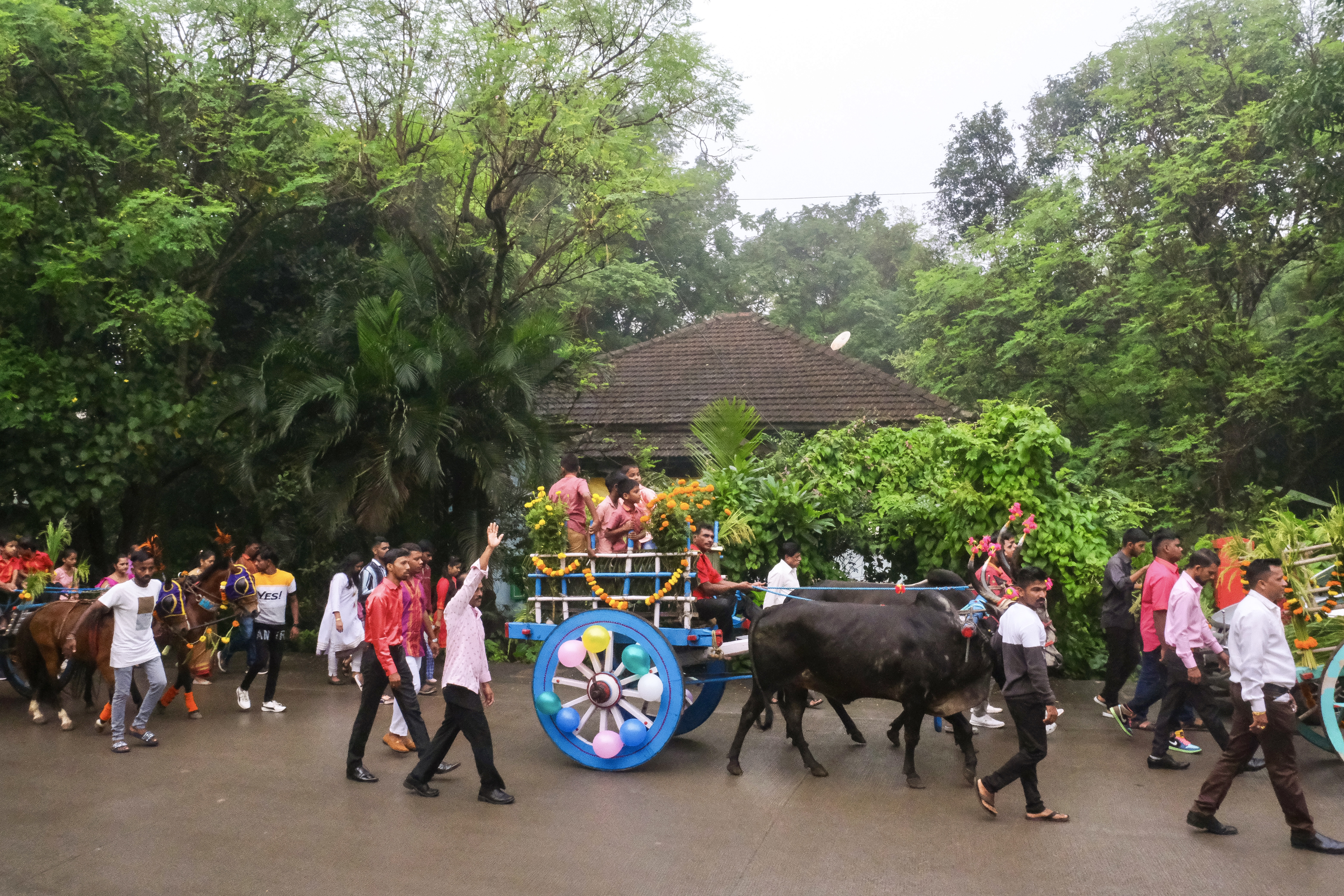 The procession passes along Dongri Road, passing old-style bungalows. Traditional East Indian houses feature tiled roofs, which help keep the interiors cool during hot summer months. They also have large verandas or porches that serve as spaces for socializing.