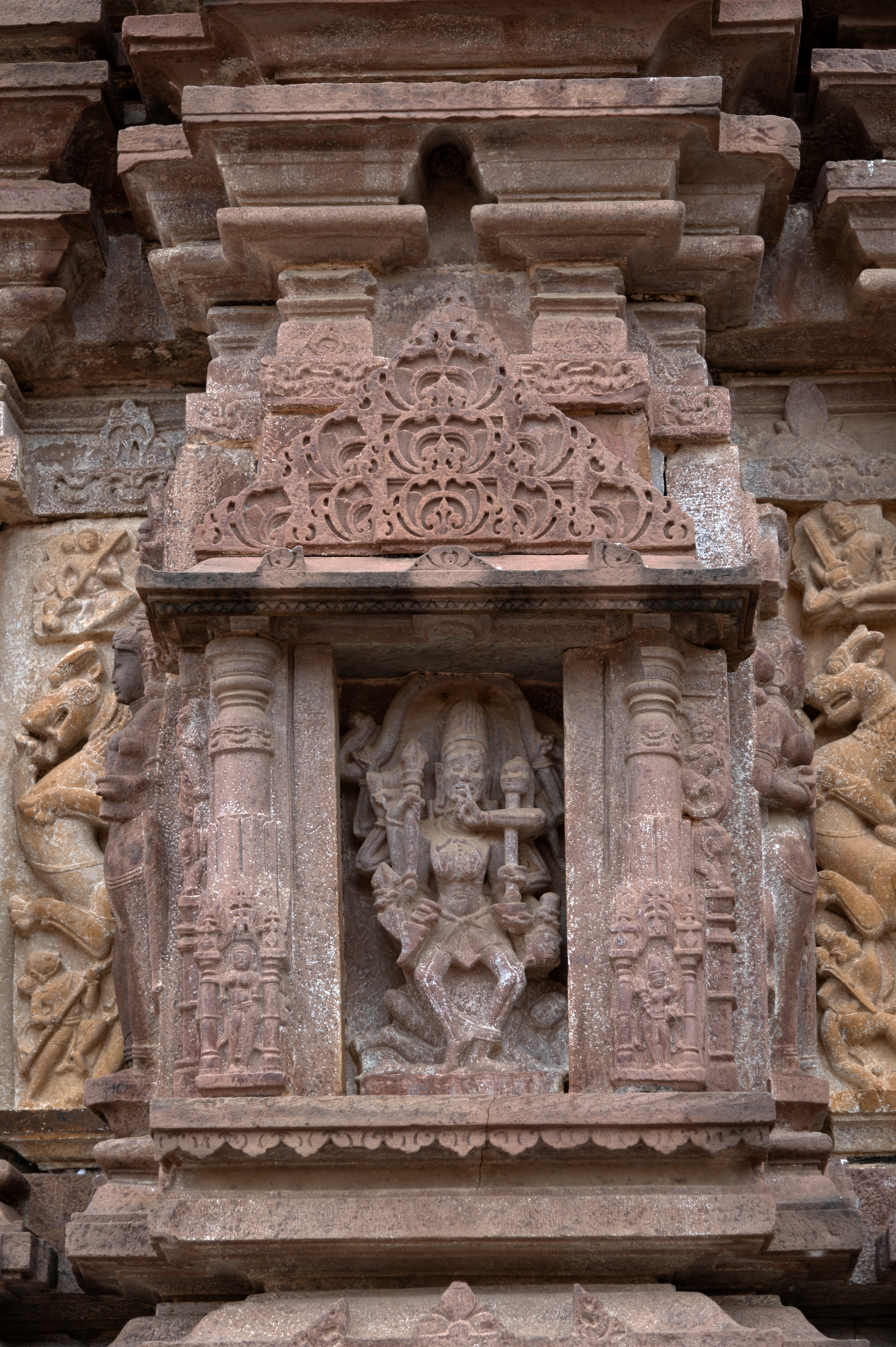 Pictured here are the details of the bhadra (central projection) from the north-facing elevation of the Mahanaleshwar Temple. The devakoshtha (niche) on the central bhadra projection is a deep niche with an image of eight armed Chamunda inside. The devakoshtha is made up of two ornate pilasters that have icons at the base. These pilasters stand on a pedestal which is fashioned like a kapotali (cyma recta) and supports an udgama (pediment) above. This udgama is made up of a mesh of gavakshas (chaitya or dormer window arches) arranged like a pyramid. The east and west-facing sides of the devakoshthas have attendants. Chamunda has a skeletal body, stands on a dead human body, and holds a kapaal (human skull), khatvanga (staff with a skull), trishula (trident), naag (serpent), damru (hourglass-shaped drum), etc. attributes. She is biting the finger of her upper left hand.