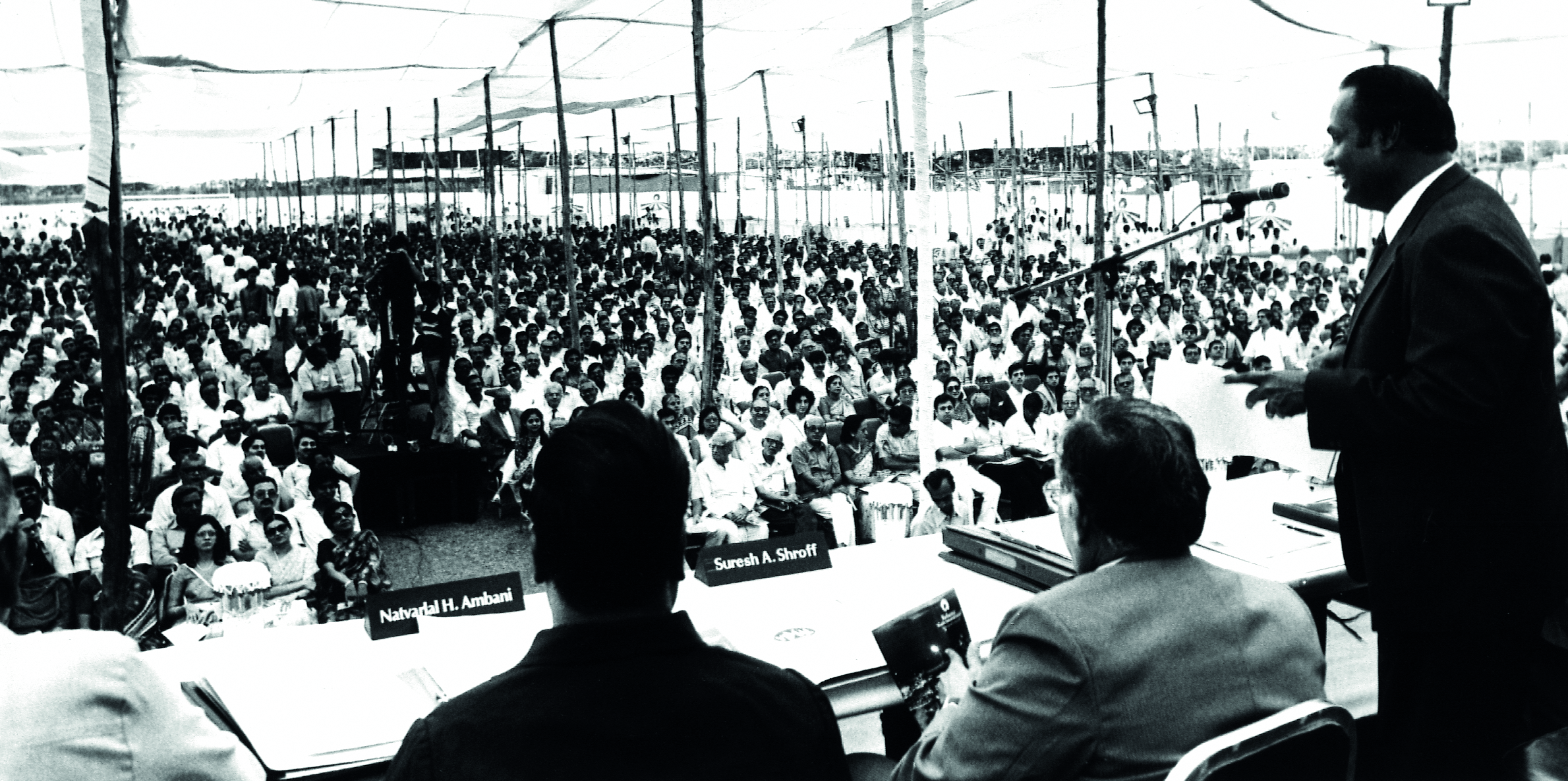 Shri Dhirubhai Ambani booked the Cooperage Football Ground in Colaba to host a mega-AGM event. It was reported in Financial Times as ‘the world’s largest company AGM’ attended by 12,000 Reliance shareholders. 'My investors are my biggest bankers,' Shri Dhirubhai Ambani said, acknowledging the massive crowd. Image Courtesy: Reliance Industries Limited.