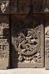 Tablet-like plaques are placed on the adhisthana (facing east). These plaques depict various types of flora and fauna as well as hybrid creatures like kinnara, vyala, and makara. The plaques are tightly arranged, richly detailed, and deeply carved, creating contrasting shadows that make the artwork look three-dimensional in sunlight. The central artwork of the plaque is in the form of a circular medallion surrounded by a foliage motif. In this medallion, a bird (likely a peacock) with its head bent downwards is integrated with a creeper motif. The rest of the plaque is covered with ardha padma (half lotus) and kalpa lata (creeper) motifs.