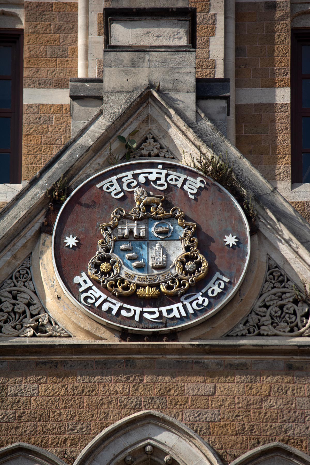 The coat-of-arms of the Brihanmumbai Mahanagarpalika (Municipal Corporation of Greater Mumbai) is prominently displayed on the facade of the BMC building. It is a four-panel shield surmounted by a heraldic lion and a blooming lotus at the base. The Sanskrit motto यतो धर्मस्ततो जय: Yato Dharmas Tato Jayaḥ (Where there is Righteousness, there shall be Victory) is inscribed in gold at the bottom.