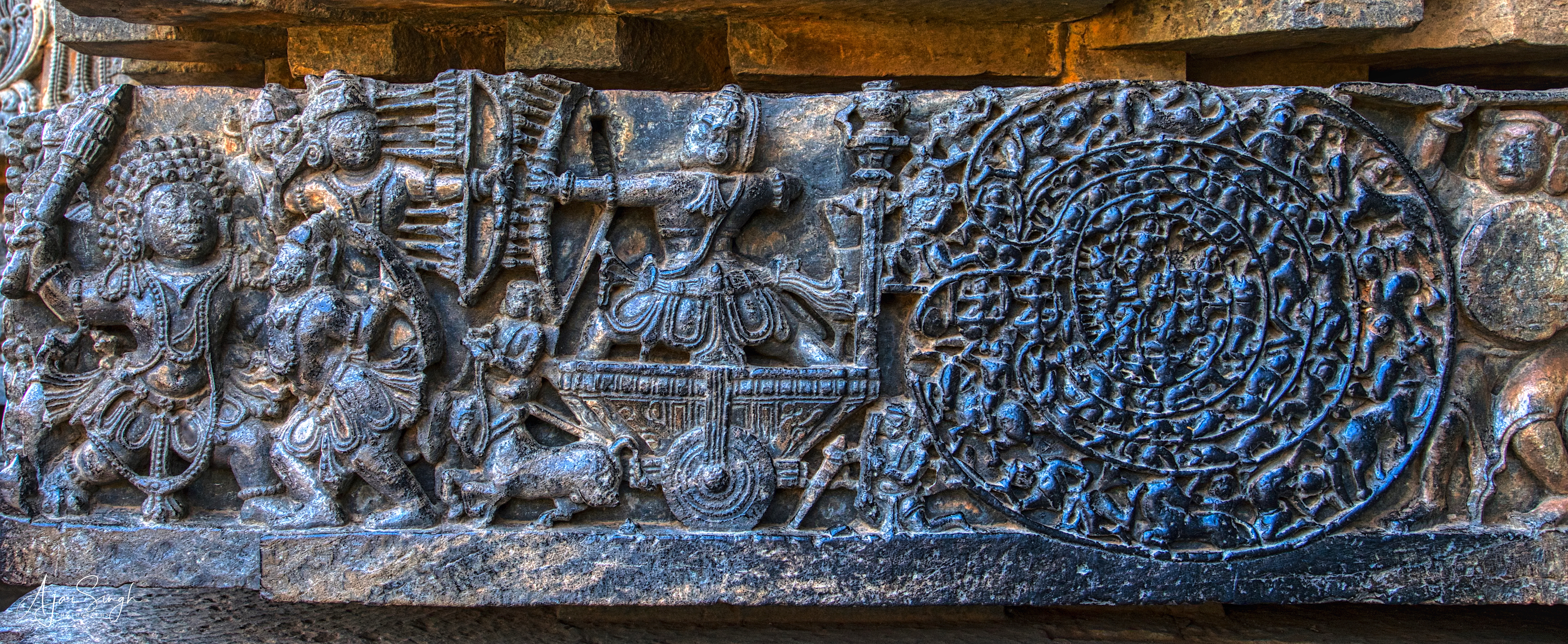 Image courtesy: Brig A.P. Singh - www.collectingmoment.in Event description from Mahabharata : Abhimanyu, the son of Arjuna and Subhadra, is shown here fighting Drona while breaking into the Chakravyuha – a complex fighting formation with soldiers arranged in seven circles, an art he learnt while still inside his mother’s womb by listening to a conversation between Krishna and Subhadra. He, however, fell asleep when Krishna narrated the part of how to break out from inside. He was the only one from the Pandavas who knew how to break inside the formation, other than Arjuna. And thus, Abhimanyu could break in, but was killed (at the age of 16 years) while trying to break out.