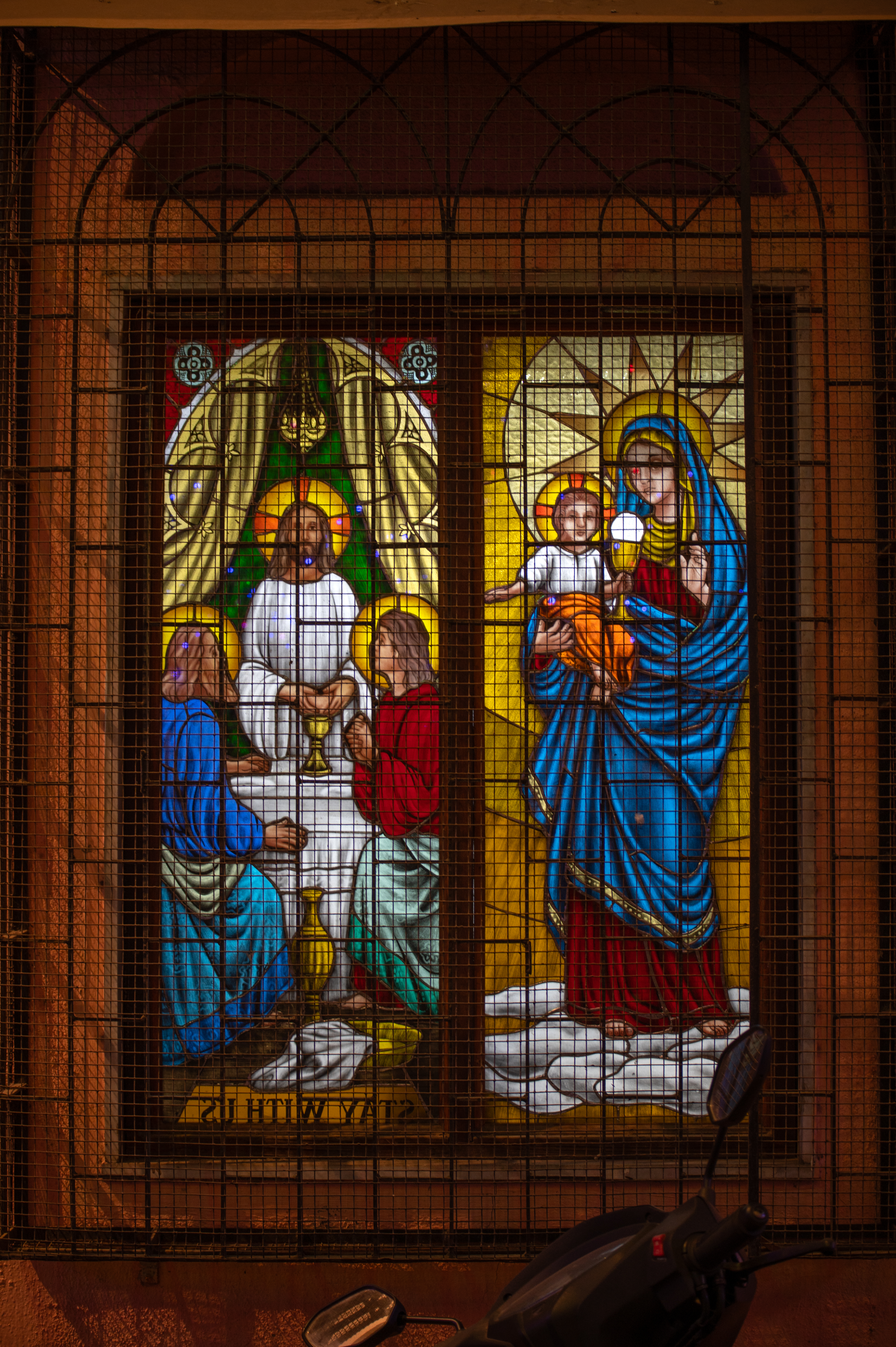 Stained glass artwork on the windows at 22 Matharpacady, depicting Mother Mary and infant Jesus (on the right panel), and the Holy Communion (on the left panel). The house was donated by the Miranda family and was renamed Eymard Cottage, and opened as the Provincialate (HQ) of the SSS Order, on September 14, 2006. It has a Blessed Sacrament Chapel and offers a daily Mass for senior citizens of the gaothan.