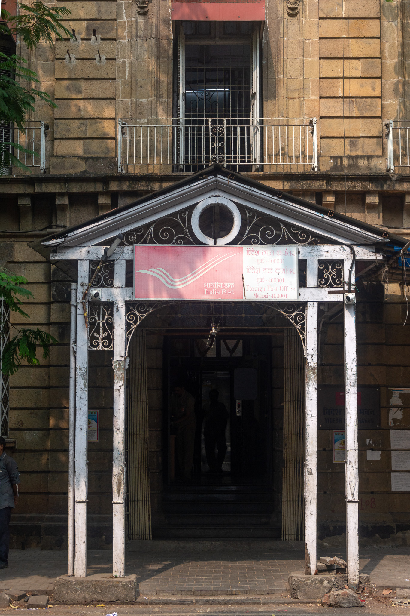 The semicircular arched entrance to the Videsh Dak Bhavan has a porch with wrought iron ornamentation, though it is partially hidden behind the India Post hoarding fixed at the front. The porch project outwards and has a sloping roof.