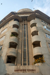 Detail of zigzag glass panel running along the central staircase, Empress Court. The tower is symmetrically framed by rounded balconies on either side.