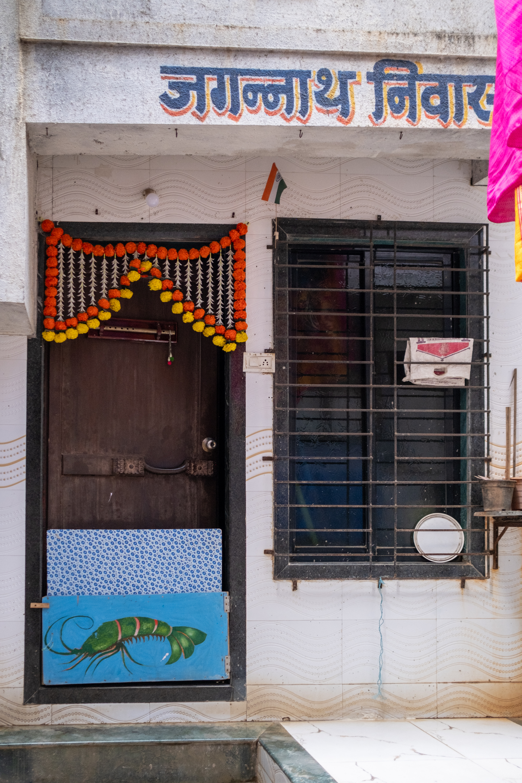 A painted shrimp outside the door of a Koli home