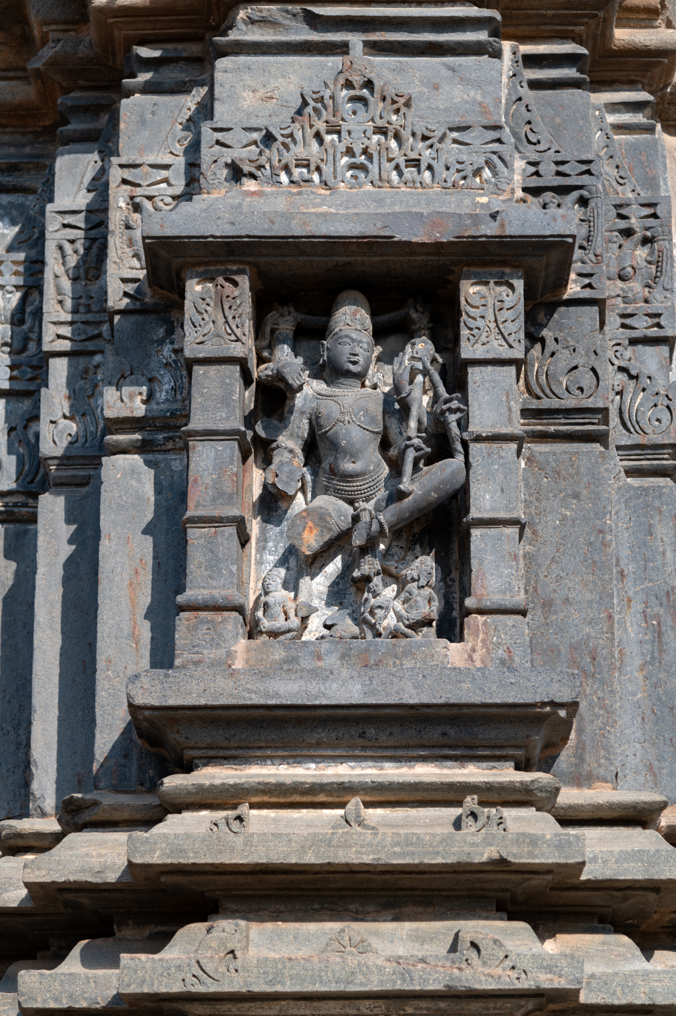 The west-facing central projection on the Mandaleshwar Mahadev Temple has an icon of Natesha. The image is framed in a decorative niche which has a pediment above it. The right side of the six-handed sculpture is broken. The lower left and upper left hands of the sculpture are shown holding a khatvanga (staff with a skull).