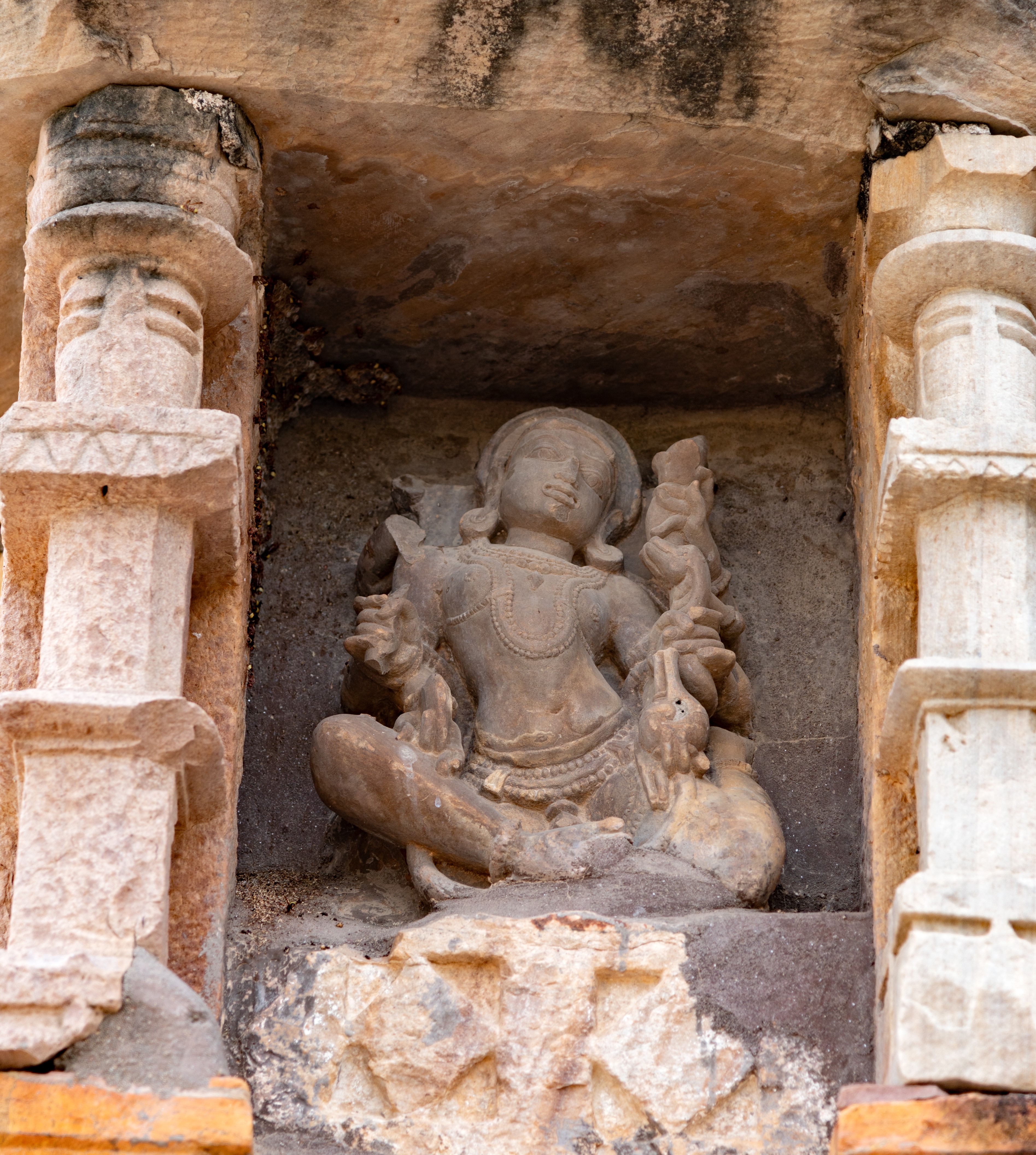 The figure installed in the bhadra (central offset) niche of the lateral wall of the garbhagriha (sanctum sanctorum) is particularly noteworthy. This unidentified deity is depicted as if it is moving through the air, with one leg raised backward. Although many of the deity’s multiple arms are broken, the intact hands display a shankha (conch shell) and a chakra (discus) in the front right and left hands, an unidentified object in the middle left hand, and a pushpa (flower) in the upper right hand.