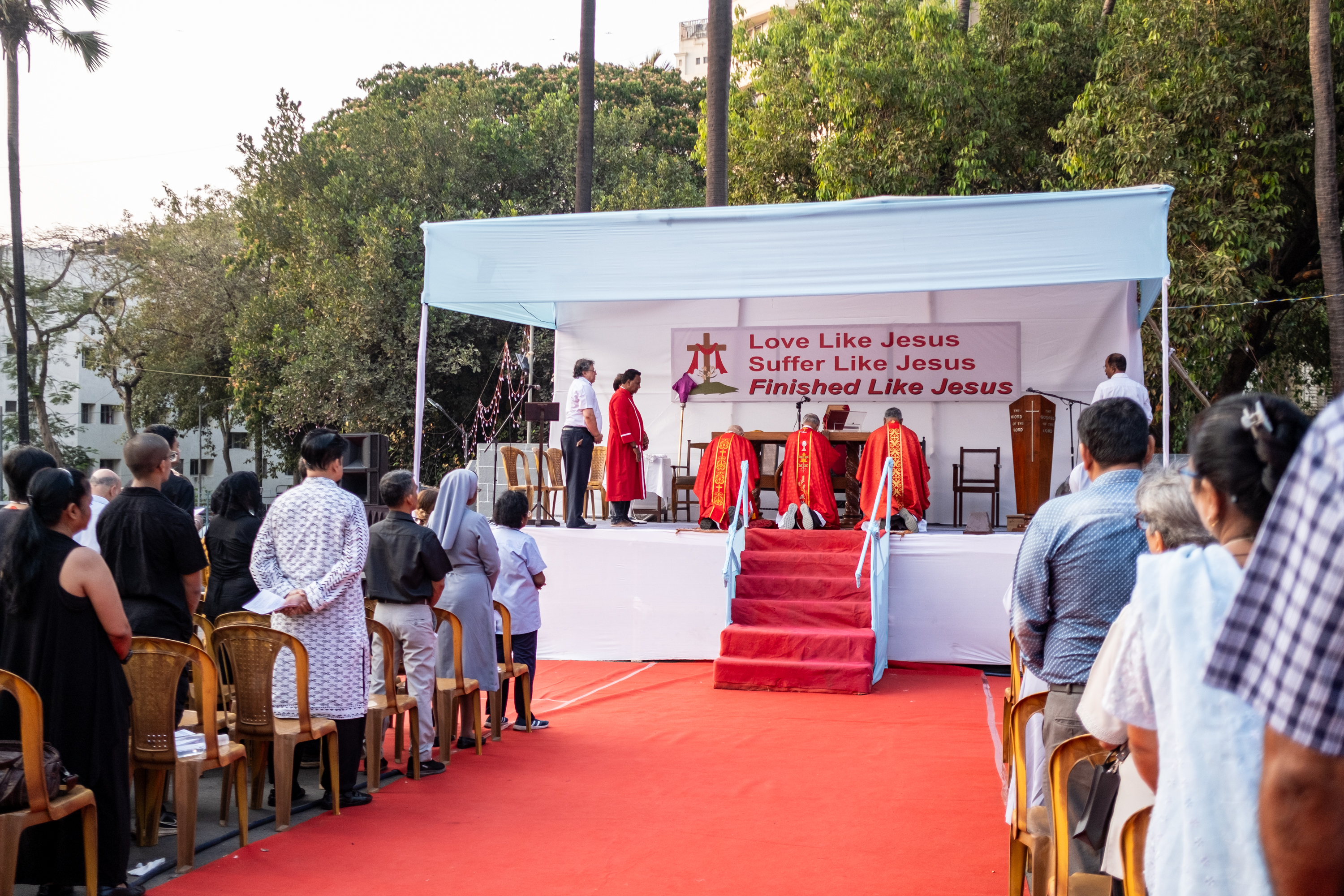 The table used for distributing the Eucharist (Holy Communion) to the faithful is consecrated and functions as a temporary altar. Such an altar typically includes essential items such as an altar cloth, a crucifix or cross, candles, and the necessary liturgical vessels (chalice, paten, ciborium).