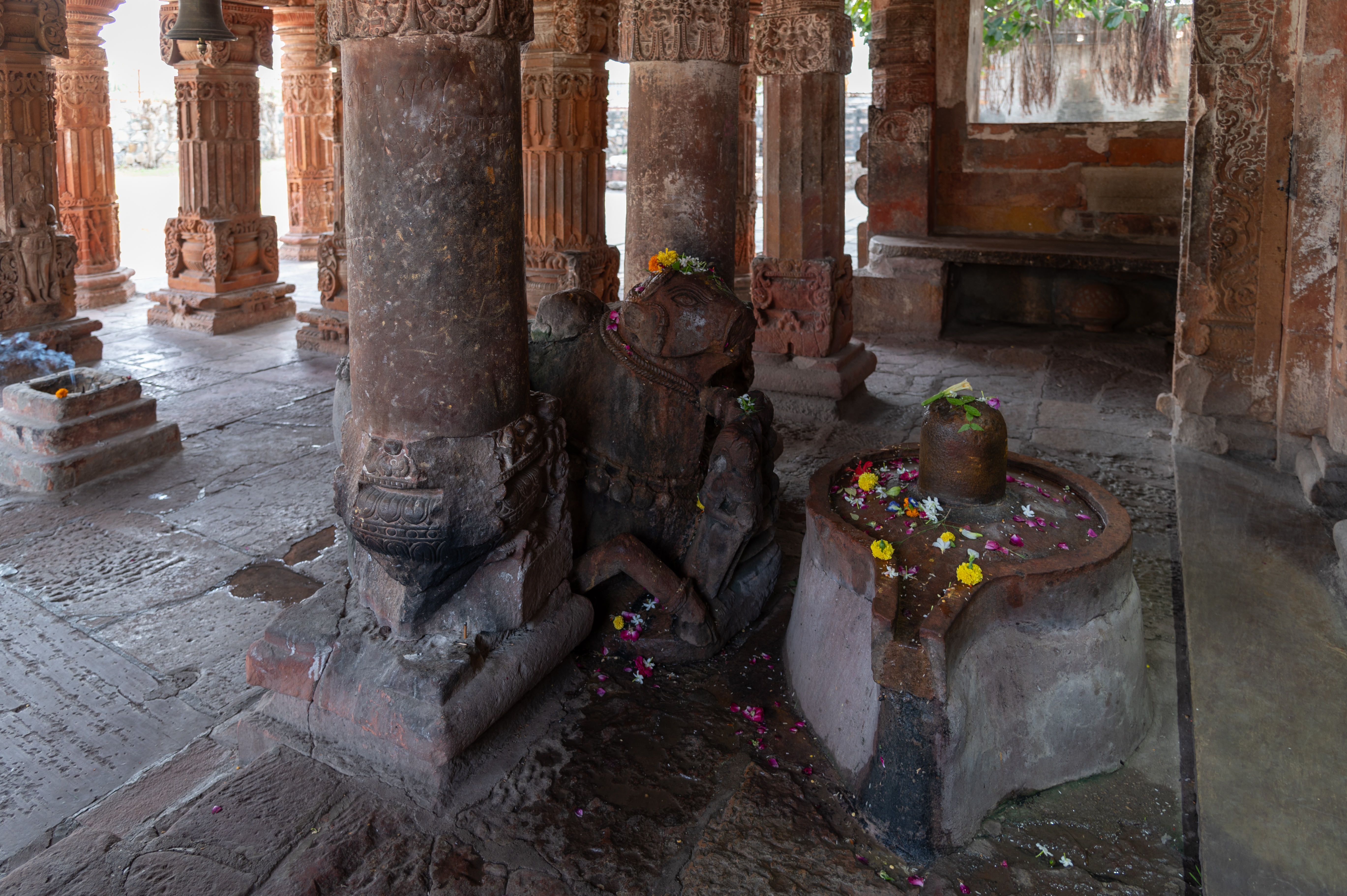 Shiva linga (aniconic representation of Shiva) and Nandi in the mandapa (pillared hall).