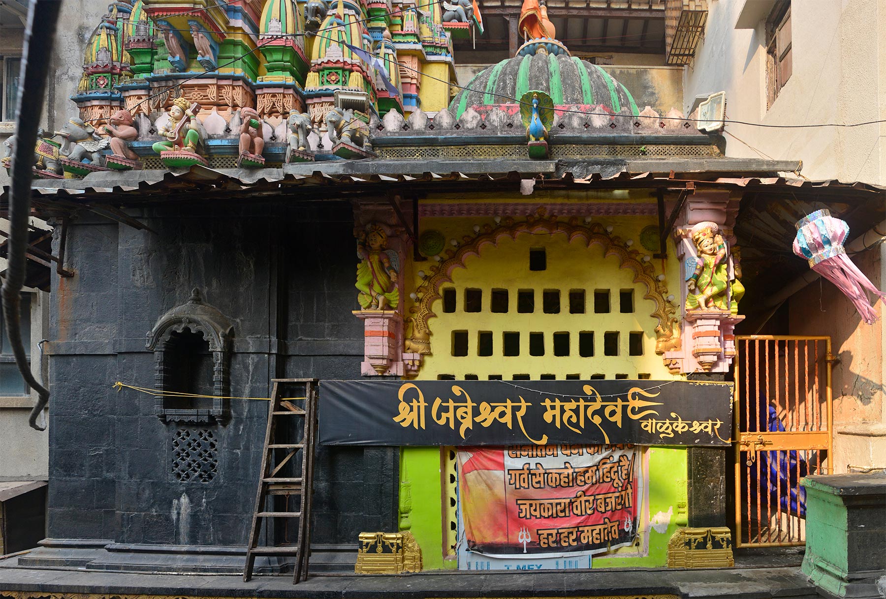 Built of black stone, the Jabreshwar Mahadev Temple is squeezed on a flat plinth along the slope of Jabreshwar Gali. An urban legend explains the quirky name of the temple because it was apparently built on land acquired by force (jabardasti). The entrance to the temple opens to Jabreshwar Gali from the side, because of buildings surrounding it on three sides.
