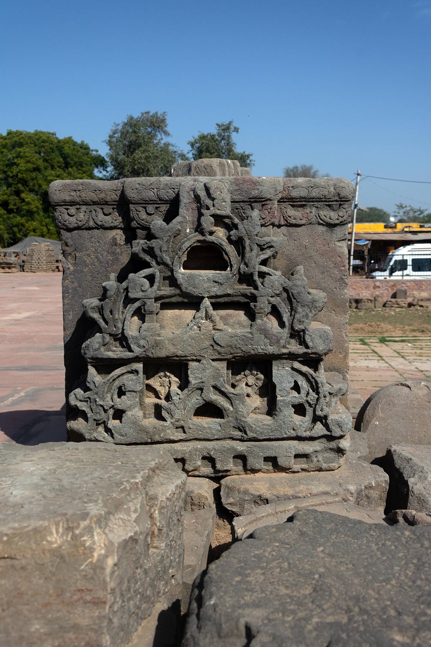 Broken debris from the original temple assembled on the landing of the first set of steps on the adhisthana. The split gavaksha motif is repeated all through the temple. It is a motif that is often seen in Hindu temples.