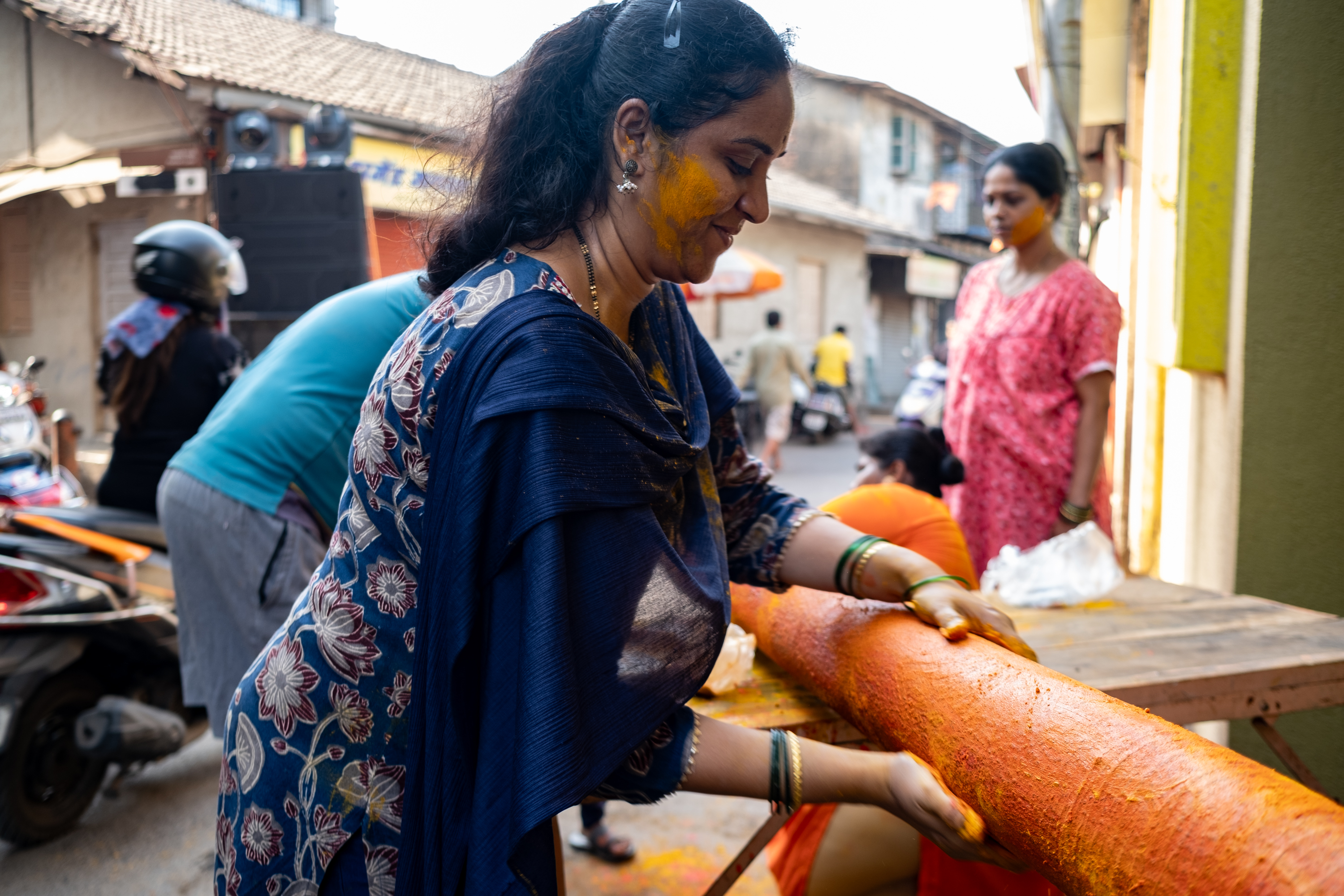 Holika is associated with fertility, marriage, and birth; hence, she is treated like a new bride. Accordingly, all the rituals that are performed for the bride during a Koli wedding are also performed for Holika.