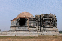 South Elevation of the Kumbheshwar Mahadev temple. The shikhara above the main shrine has only one tier remnant whereas the shikhara above the mandapa has been replaced by a crude dome. Principal niches of the temple exterior wall house Natesha, Andhakasuravadh, Chamunda. There is a shivlinga in the temple which is under worship.