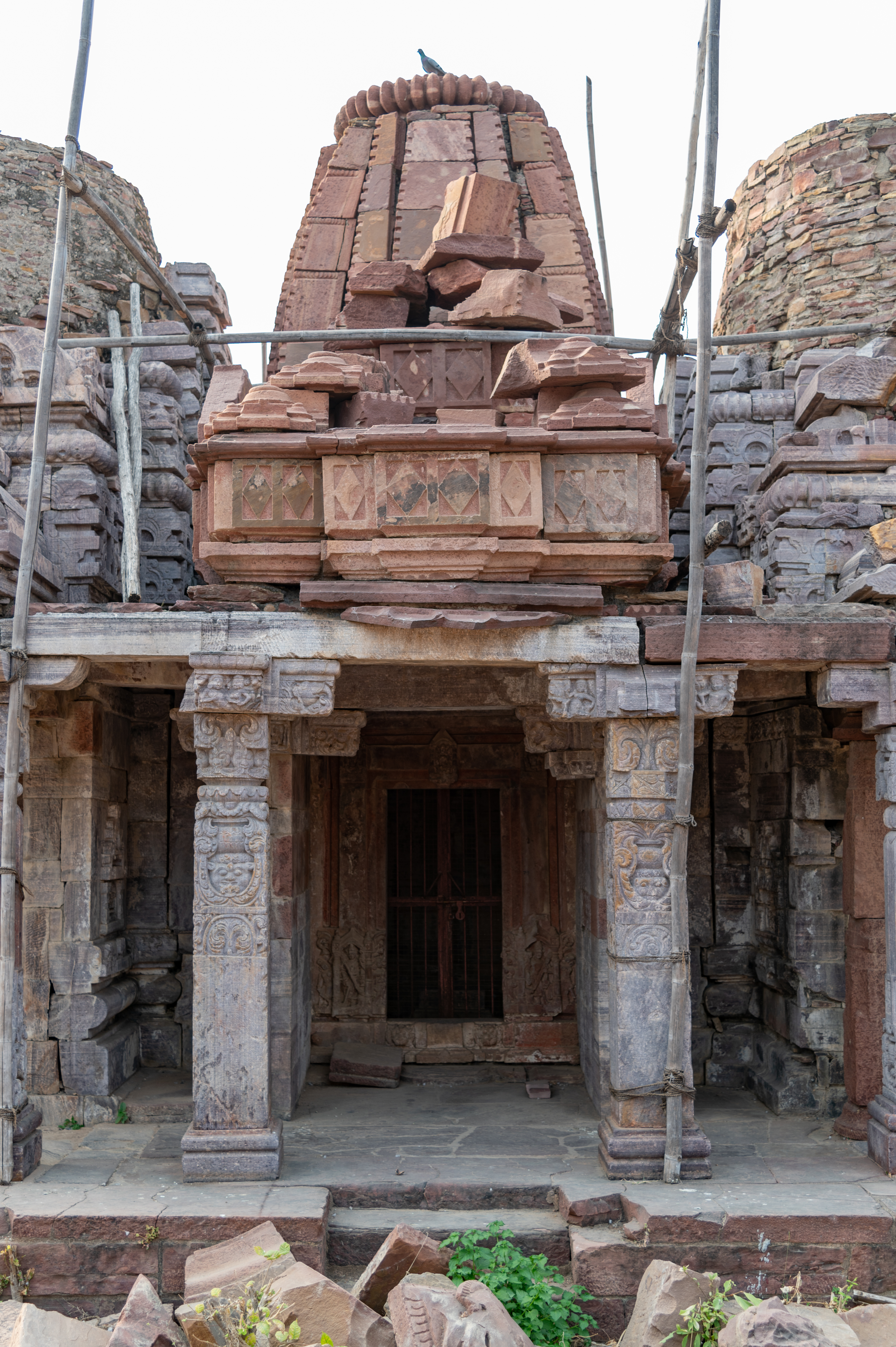 The central shrine in the Triple Shrine Temple shares the porch with its adjacent shrines. The central shrine is constructed out of a different stone than the other two shrines. The shikhara (superstructure) of the mandapa (pillared hall) is fallen. Only the basal mouldings, made up of three stone blocks with diamond motifs, have survived.