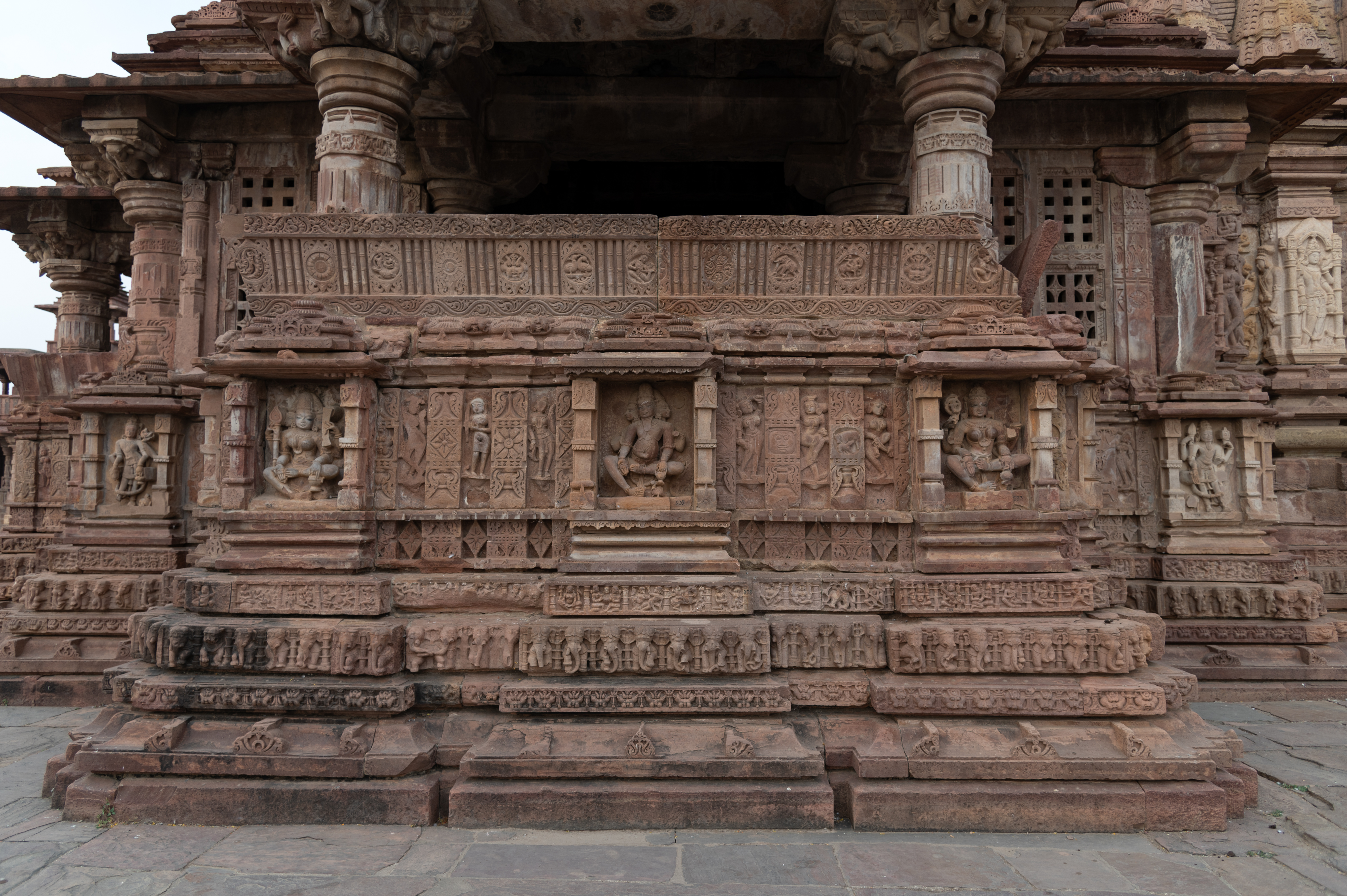 The south-facing transept of the mandapa (pillared hall) in the Mahanaleshwar Temple is identical to the north elevation. There are three devakoshthas (niches) on the dwarf wall of the mandapa. The central devakoshtha has a figure of Brahma holding a pustaka (book) and kamandalu (water carrier or pot), and the two flanking devakoshthas have consorts of Brahma, one of them is depicted with three faces. The wall between these devakoshthas is designed with pilaster motifs and interspersed with surasundaris (celestial damsels).