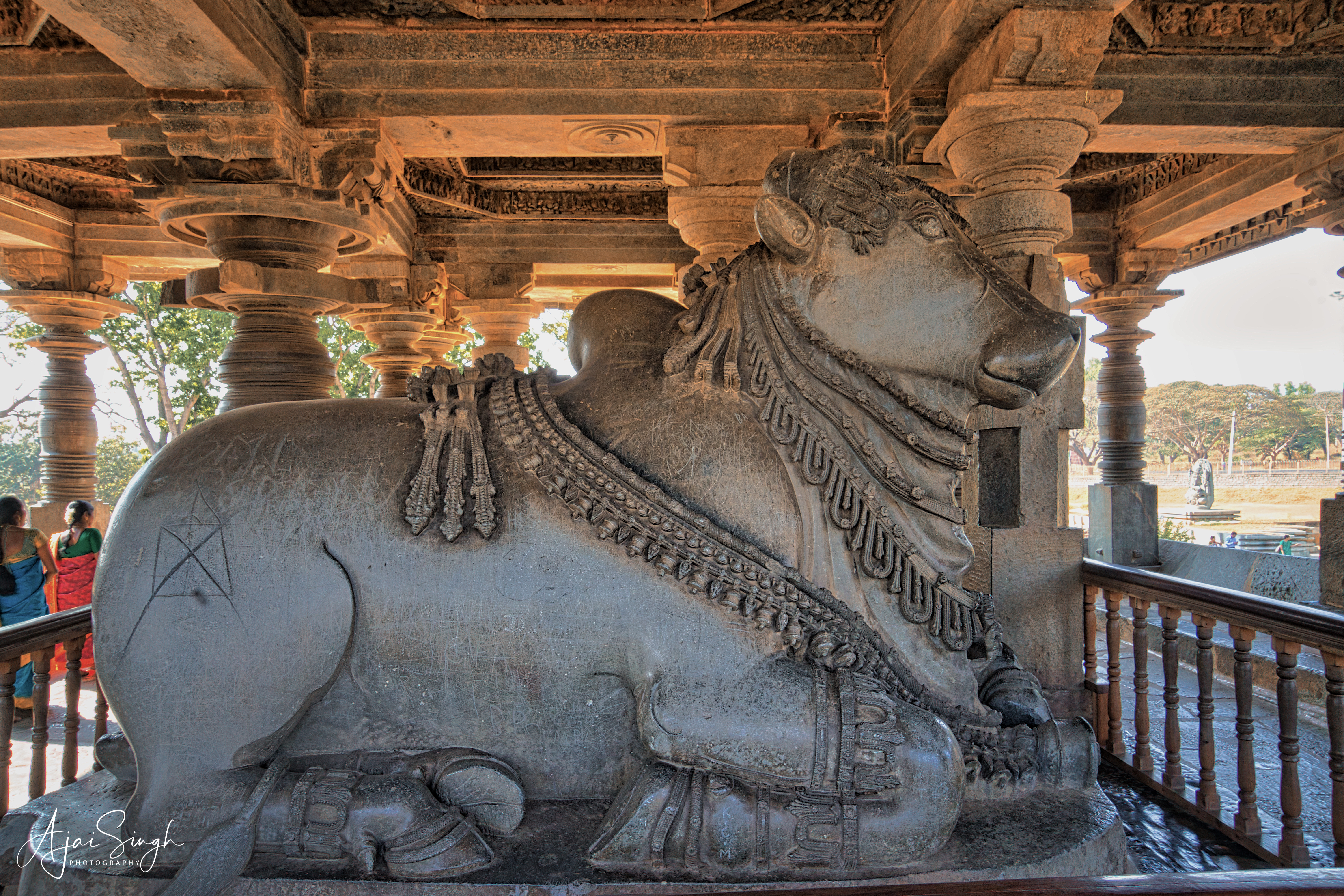 Monolithic Nandi in the southern entrance facing the Hoysaleshwara Shiva Linga - 39
