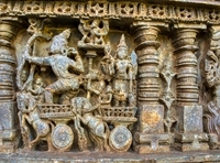 Carvings on the parapet wall - sequences from Mahabharata - Khandava dahana - Arjuna firing arrows Public Deposited