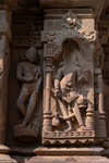 In a niche on the southern wall, of the garbhagriha (sanctum sanctorum) of the Kaner-ki-Putli Temple, a male figure is depicted. Unfortunately, the figure is damaged, with the head entirely missing. Both upper arms are broken, while the figure holds a kamandalu (water carrier or pot) in the left hand and makes a varadahasta (boon-giving gesture) with the right hand. At the base of the niche, a broken ram-like animal with horns is visible. Based on the vahana (mount), attributes, and gestures, this figure can be recognized as Agni (one of the deities of cardinal directions). Adjacent to Agni, there is a male figure that stands out from the others. This figure features curly, raised hair and a beard, but unfortunately, the face has been eroded. The upper body is bare and adorned with jewellery, while the lower body is covered by a distinctive triangular loin cloth. An antaravastra (inner garment) is visible beneath the loin cloth. The figure is draped with a scarf wrapped around the arms, and although the broken object held in his two hands is now incomplete, the visible middle part resembles a stick. Notably, this figure is unique because of the distinctive dressing style and footwear, suggesting him to be a foreigner.