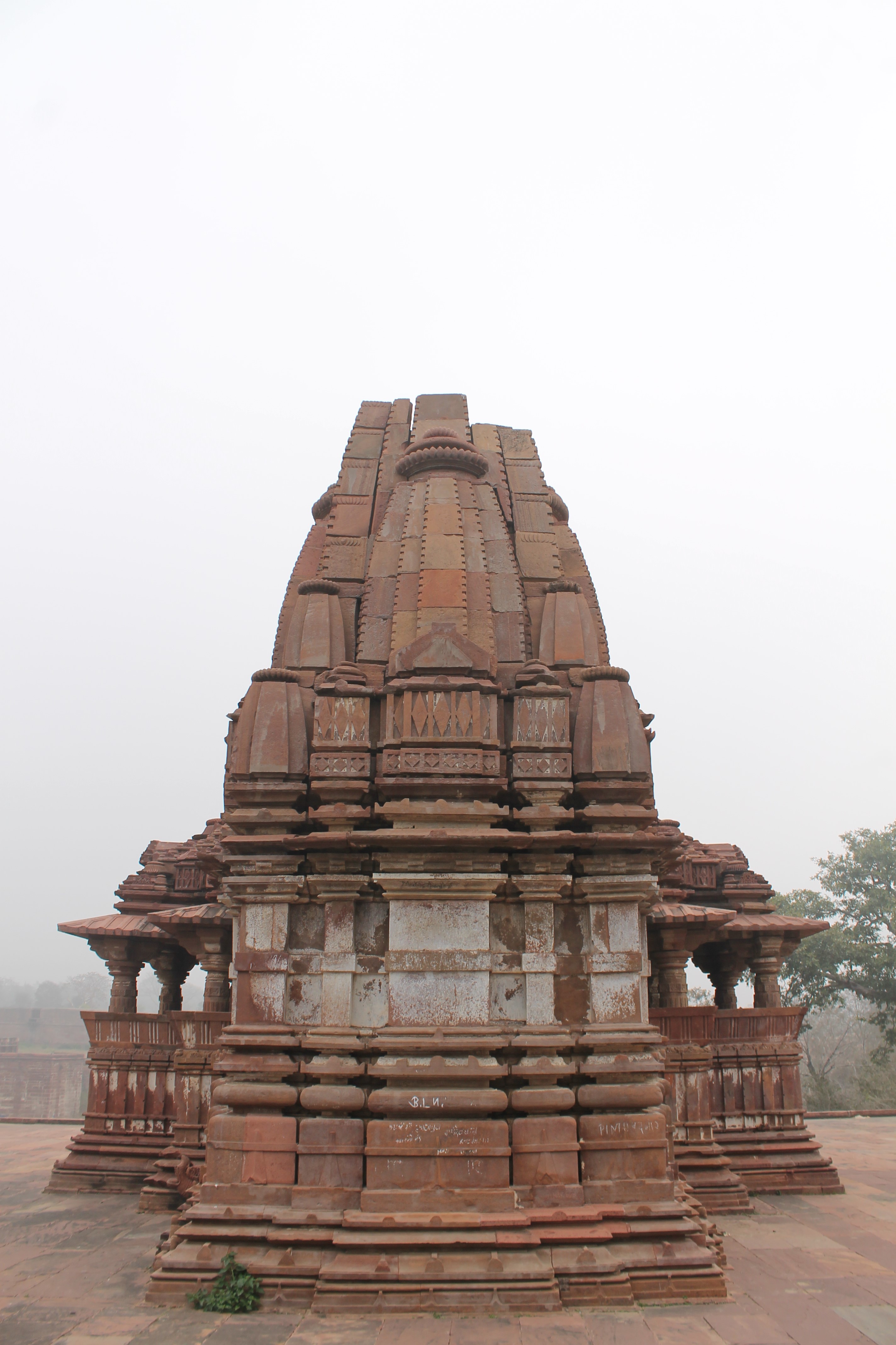 The west-facing elevation of the Suhaveshwar Temple is seen here. The main shrine has a vedibandha (basal mouldings), followed by a jangha (wall). The temple has a shekhari (multi-spired) variety of shikhara (superstructure). The shikhara is composed of a row of small aedicules with a shukanasa, the front of the shikhara, of diamond motifs at the centre. Emanating from these is the mulashringa (main shikhara) of the temple. This is also made up of different divisions, angas and pratyangas. The entire shikhara has minimal ornamentation.